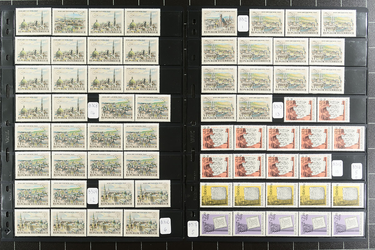 Accumulation of primarily never hinged Austria, 1908-1993, containing about 1,600 stamps in roughly 15 stock or album pages. The lot generally ranges from Scott #119a/1417, containing sets, partial sets, souvenir sheets and back of the book issues. Owner's 2019 Scott catalogue value for the lot totals US$765.00, with duplication between 5 to 10 for some issues. A clean lot for all collectors. Estimate =