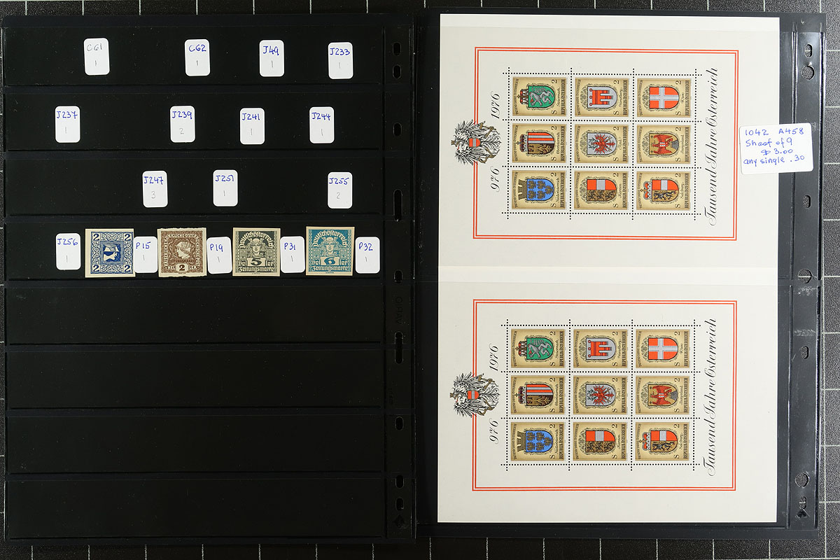 Accumulation of primarily never hinged Austria, 1908-1993, containing about 1,600 stamps in roughly 15 stock or album pages. The lot generally ranges from Scott #119a/1417, containing sets, partial sets, souvenir sheets and back of the book issues. Owner's 2019 Scott catalogue value for the lot totals US$765.00, with duplication between 5 to 10 for some issues. A clean lot for all collectors. Estimate =