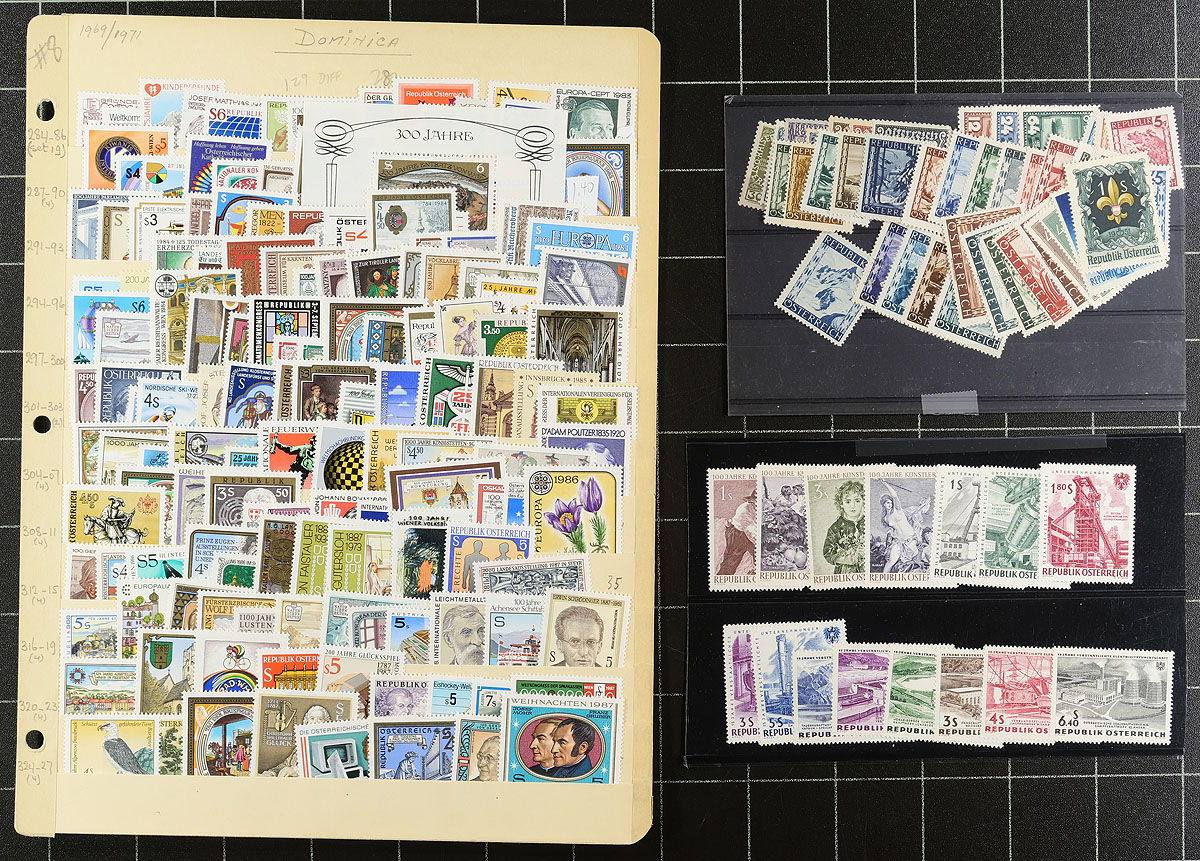Accumulation of primarily never hinged Austria, 1908-1993, containing about 1,600 stamps in roughly 15 stock or album pages. The lot generally ranges from Scott #119a/1417, containing sets, partial sets, souvenir sheets and back of the book issues. Owner's 2019 Scott catalogue value for the lot totals US$765.00, with duplication between 5 to 10 for some issues. A clean lot for all collectors. Estimate =