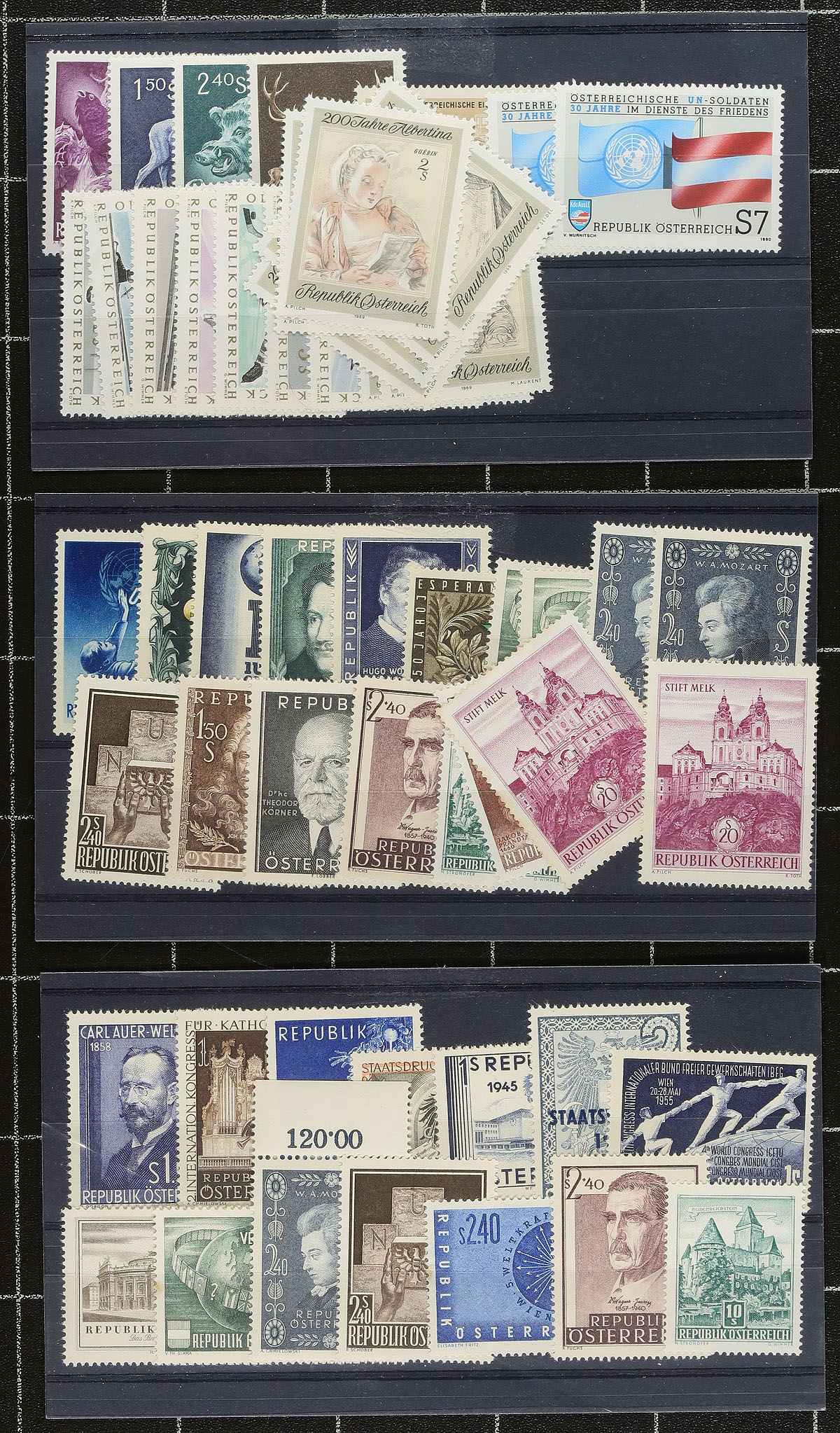 Accumulation of primarily never hinged Austria, 1908-1993, containing about 1,600 stamps in roughly 15 stock or album pages. The lot generally ranges from Scott #119a/1417, containing sets, partial sets, souvenir sheets and back of the book issues. Owner's 2019 Scott catalogue value for the lot totals US$765.00, with duplication between 5 to 10 for some issues. A clean lot for all collectors. Estimate =