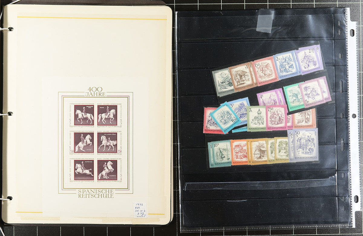 Accumulation of primarily never hinged Austria, 1908-1993, containing about 1,600 stamps in roughly 15 stock or album pages. The lot generally ranges from Scott #119a/1417, containing sets, partial sets, souvenir sheets and back of the book issues. Owner's 2019 Scott catalogue value for the lot totals US$765.00, with duplication between 5 to 10 for some issues. A clean lot for all collectors. Estimate =