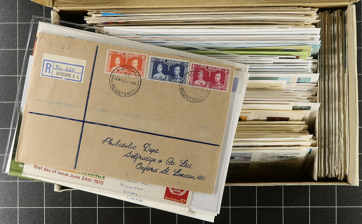 Collection of roughly 275 New Zealand first day covers, 1940's-1999, with a few possible on either side of the given range. We note singles, several sets, souvenir sheet, and high denomination frankings, including several suitable thematic and topical subjects encountering nature, sports, transportation, and much more. A few covers have a few corners, overall a fine to very fine lot. Estimate =