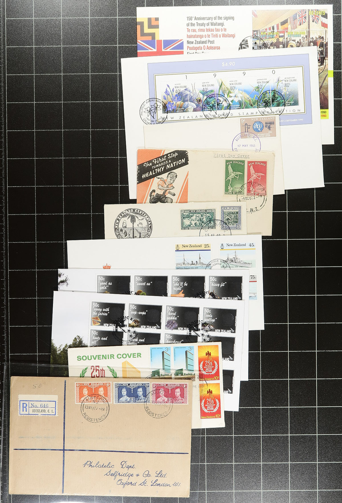 Collection of roughly 275 New Zealand first day covers, 1940's-1999, with a few possible on either side of the given range. We note singles, several sets, souvenir sheet, and high denomination frankings, including several suitable thematic and topical subjects encountering nature, sports, transportation, and much more. A few covers have a few corners, overall a fine to very fine lot. Estimate =