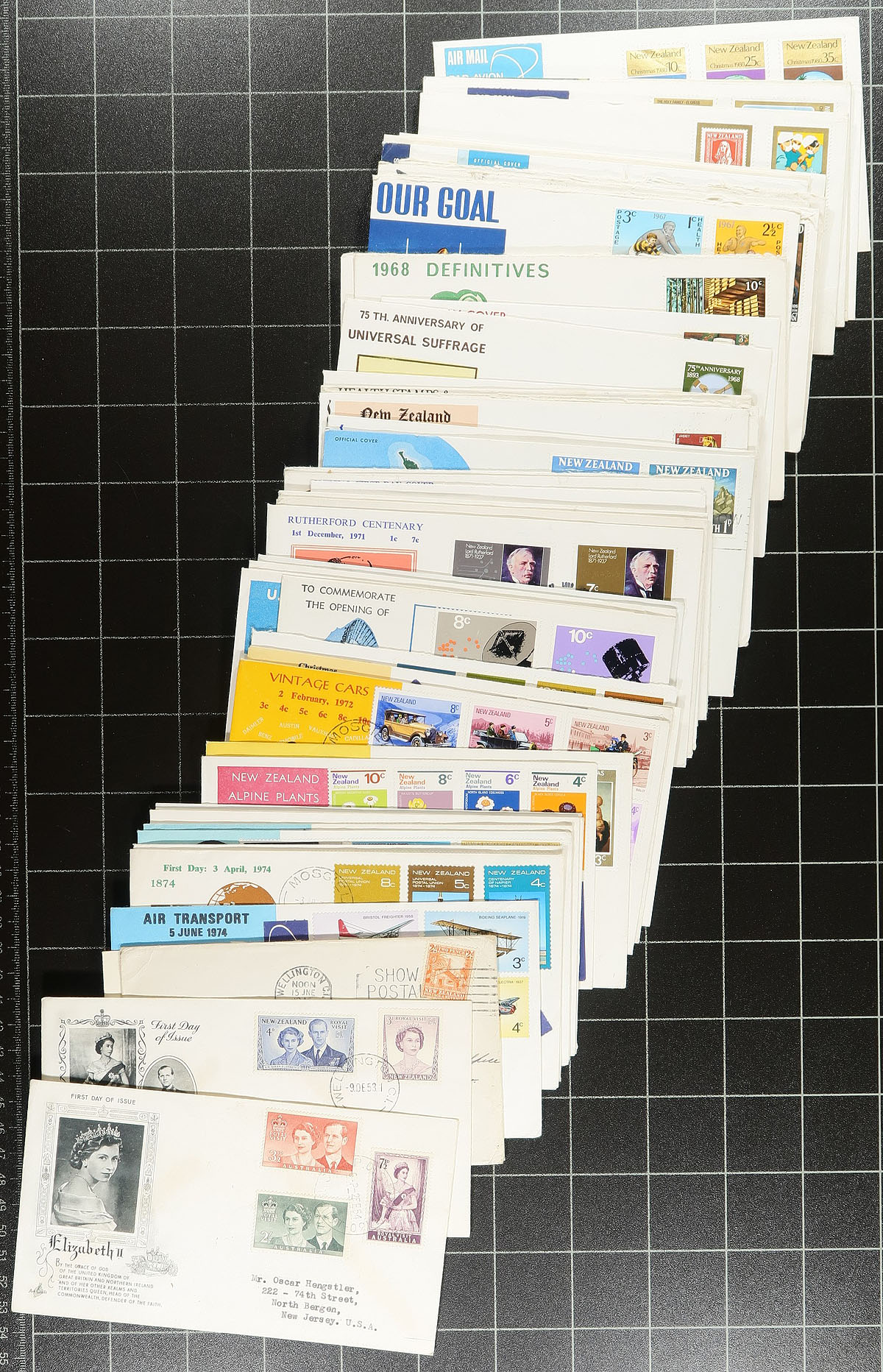 Collection of roughly 275 New Zealand first day covers, 1940's-1999, with a few possible on either side of the given range. We note singles, several sets, souvenir sheet, and high denomination frankings, including several suitable thematic and topical subjects encountering nature, sports, transportation, and much more. A few covers have a few corners, overall a fine to very fine lot. Estimate =