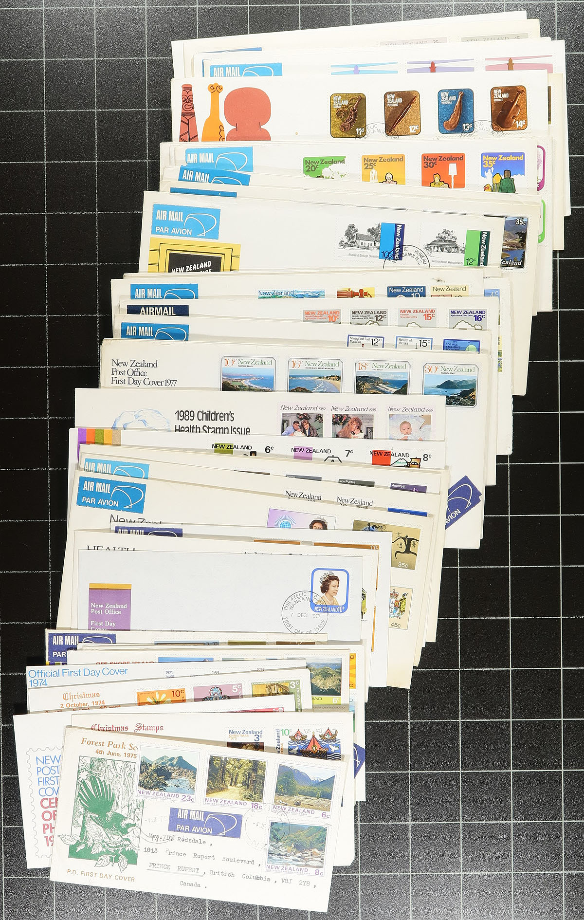 Collection of roughly 275 New Zealand first day covers, 1940's-1999, with a few possible on either side of the given range. We note singles, several sets, souvenir sheet, and high denomination frankings, including several suitable thematic and topical subjects encountering nature, sports, transportation, and much more. A few covers have a few corners, overall a fine to very fine lot. Estimate =