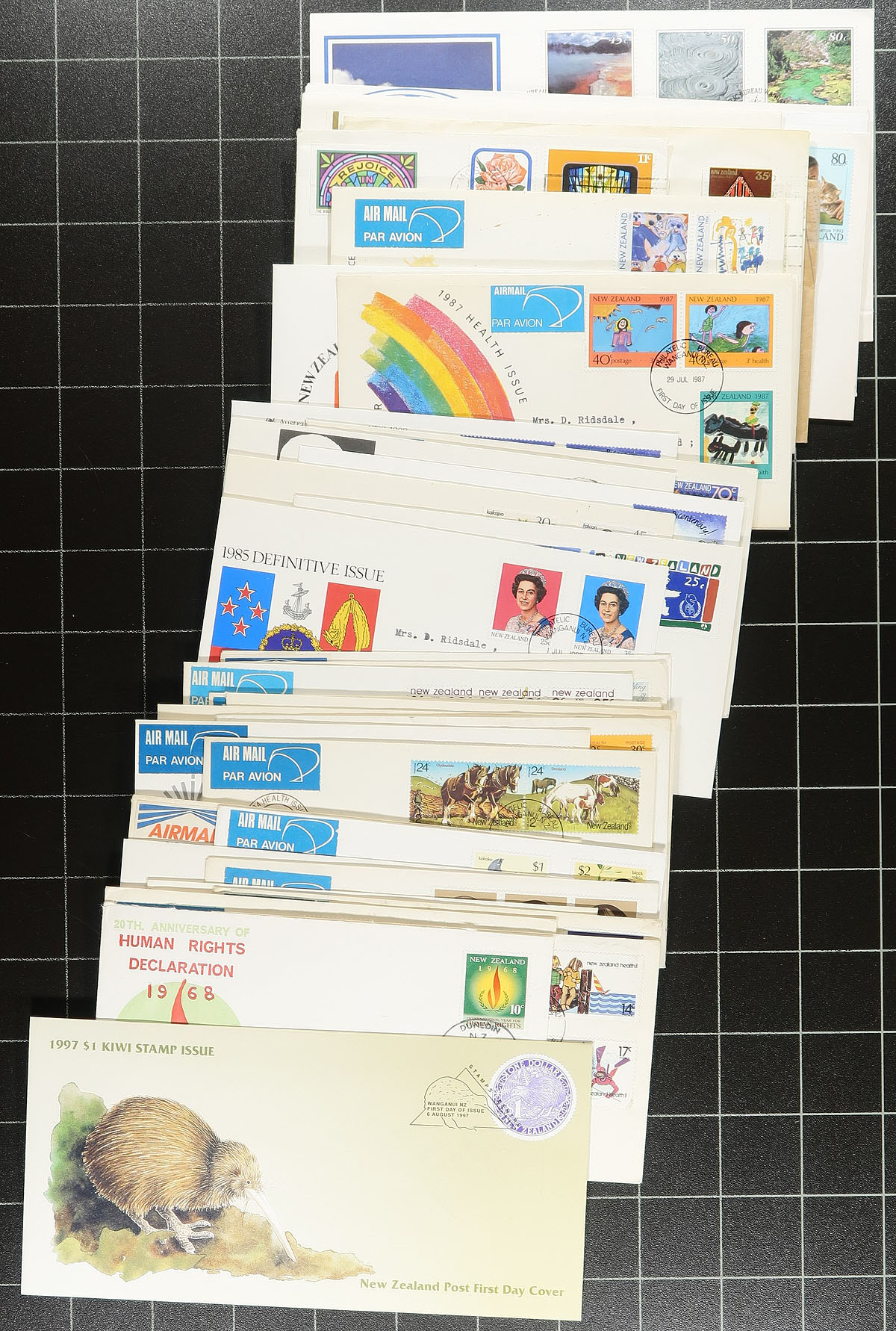 Collection of roughly 275 New Zealand first day covers, 1940's-1999, with a few possible on either side of the given range. We note singles, several sets, souvenir sheet, and high denomination frankings, including several suitable thematic and topical subjects encountering nature, sports, transportation, and much more. A few covers have a few corners, overall a fine to very fine lot. Estimate =