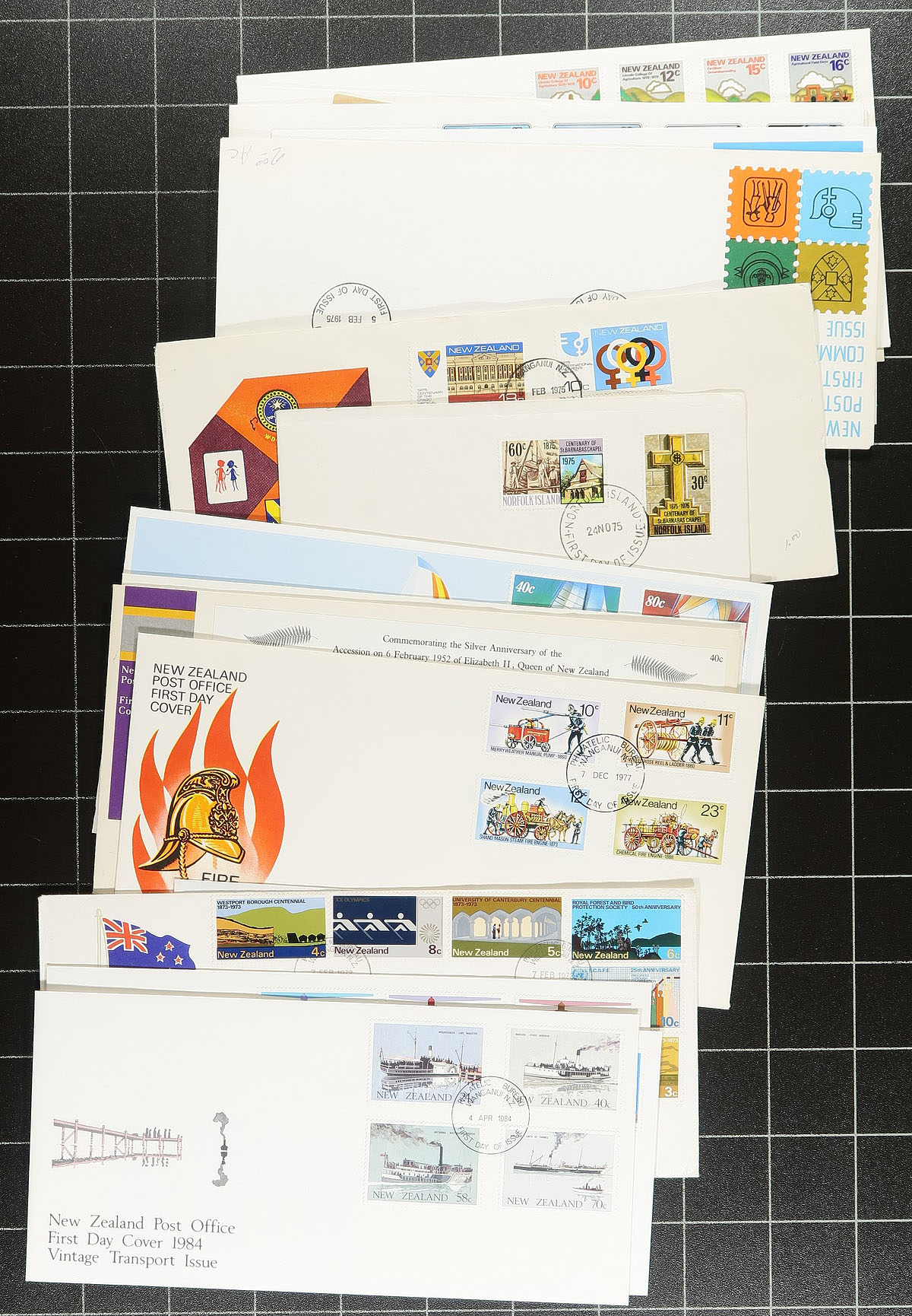 Collection of roughly 275 New Zealand first day covers, 1940's-1999, with a few possible on either side of the given range. We note singles, several sets, souvenir sheet, and high denomination frankings, including several suitable thematic and topical subjects encountering nature, sports, transportation, and much more. A few covers have a few corners, overall a fine to very fine lot. Estimate =
