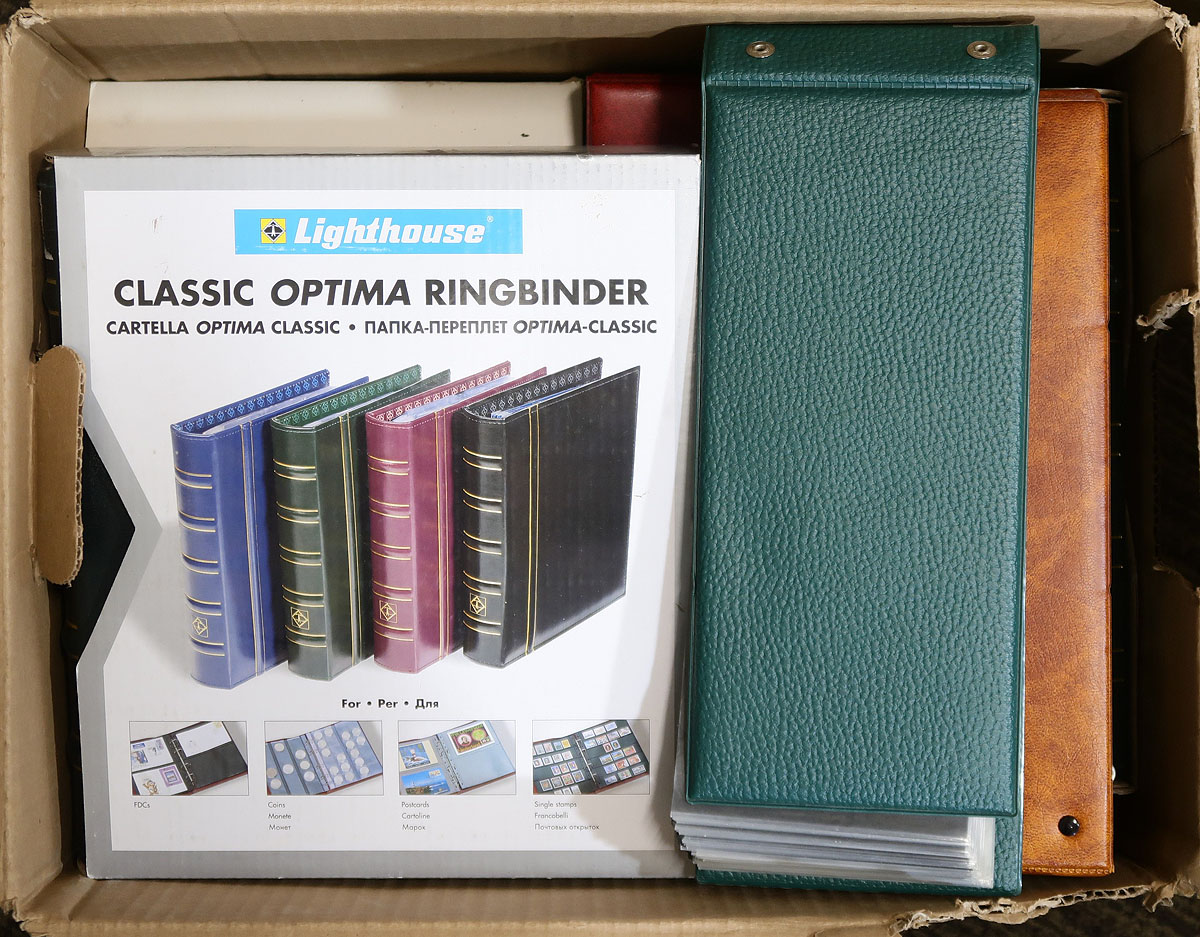 Carton full of gently used to like new albums and pages for cover collectors. Roughly 20 items in total, primarily cover albums for short and long covers, along with two Lighthouse binders with slipcases containing several 2-row Vario style stock pages, ideal for cover collectors. A good lot for collectors with retail prices generally ranging from $15 to $20 per album. Estimate =
