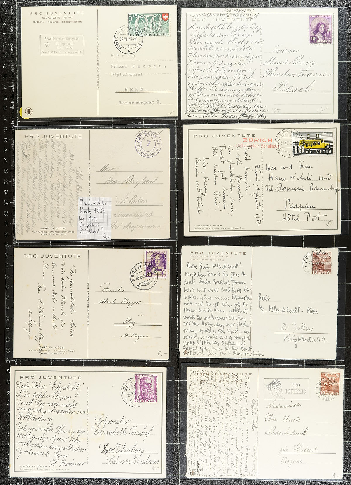 Interesting collection of Switzerland postal stationery and Pro-Juventute cards, 1912-1949, with roughly 160 items in total. We note almost all the items are used, mostly for domestic purposes, but did spot foreign destinations including Cuba, France, United States, Germany, and perhaps more, along with a wide variety of frankings including several semi-postals. Postmark interest includes bridge types, railways, feldpost, slogan, and more. Almost all the cards are sleeved and identified by the owner, with retail prices ranging from $2 to $8 each. A very collectible lot for the picture side, or for the postal history. Estimate =