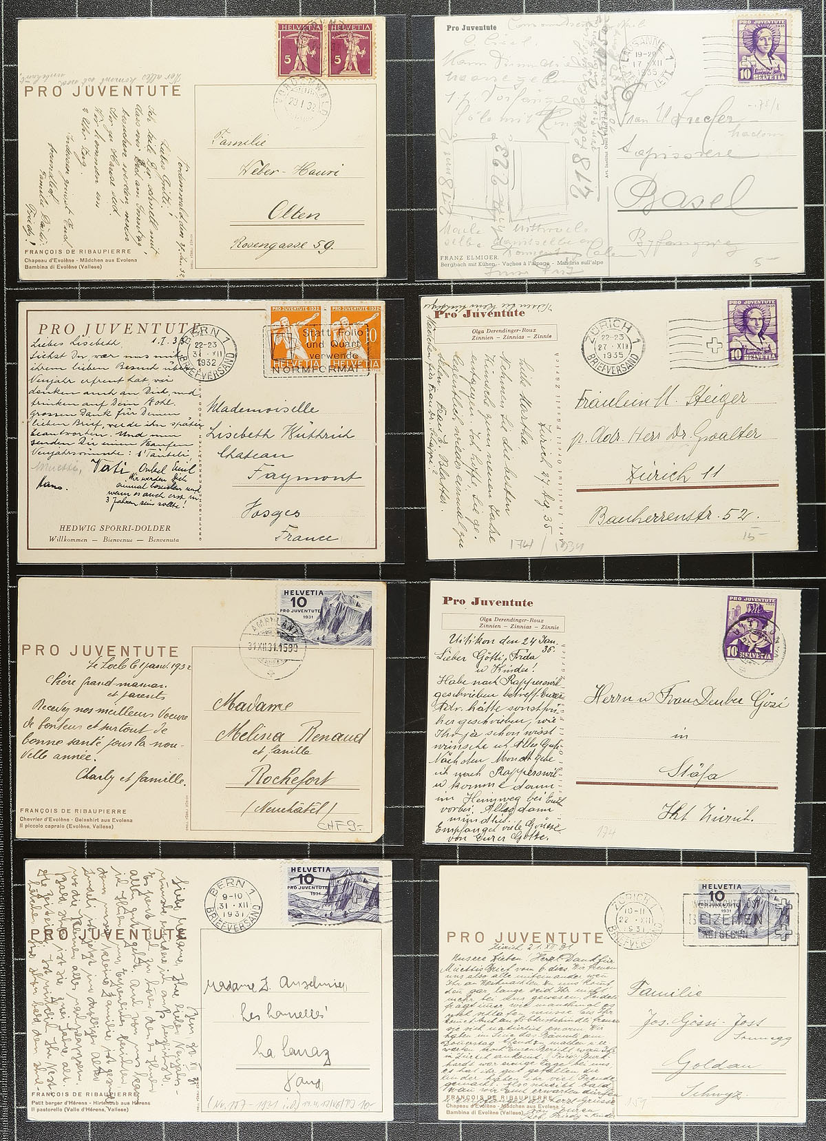 Interesting collection of Switzerland postal stationery and Pro-Juventute cards, 1912-1949, with roughly 160 items in total. We note almost all the items are used, mostly for domestic purposes, but did spot foreign destinations including Cuba, France, United States, Germany, and perhaps more, along with a wide variety of frankings including several semi-postals. Postmark interest includes bridge types, railways, feldpost, slogan, and more. Almost all the cards are sleeved and identified by the owner, with retail prices ranging from $2 to $8 each. A very collectible lot for the picture side, or for the postal history. Estimate =