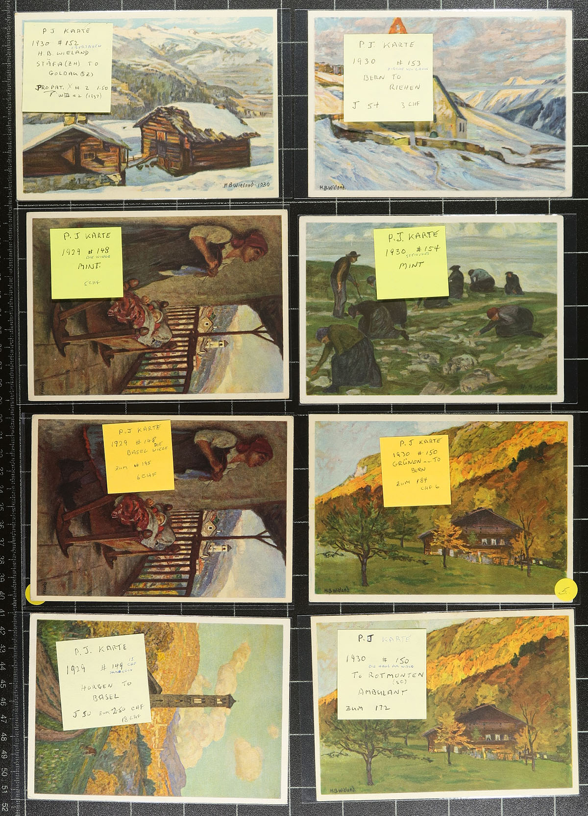 Interesting collection of Switzerland postal stationery and Pro-Juventute cards, 1912-1949, with roughly 160 items in total. We note almost all the items are used, mostly for domestic purposes, but did spot foreign destinations including Cuba, France, United States, Germany, and perhaps more, along with a wide variety of frankings including several semi-postals. Postmark interest includes bridge types, railways, feldpost, slogan, and more. Almost all the cards are sleeved and identified by the owner, with retail prices ranging from $2 to $8 each. A very collectible lot for the picture side, or for the postal history. Estimate =