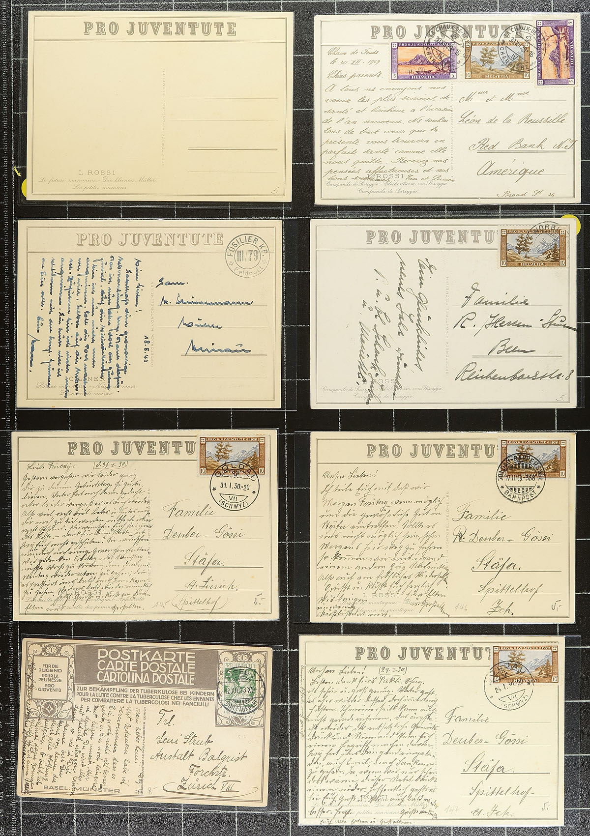 Interesting collection of Switzerland postal stationery and Pro-Juventute cards, 1912-1949, with roughly 160 items in total. We note almost all the items are used, mostly for domestic purposes, but did spot foreign destinations including Cuba, France, United States, Germany, and perhaps more, along with a wide variety of frankings including several semi-postals. Postmark interest includes bridge types, railways, feldpost, slogan, and more. Almost all the cards are sleeved and identified by the owner, with retail prices ranging from $2 to $8 each. A very collectible lot for the picture side, or for the postal history. Estimate =