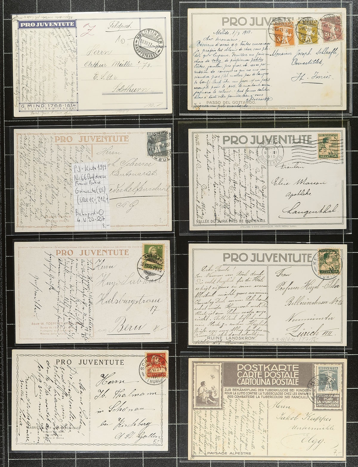 Interesting collection of Switzerland postal stationery and Pro-Juventute cards, 1912-1949, with roughly 160 items in total. We note almost all the items are used, mostly for domestic purposes, but did spot foreign destinations including Cuba, France, United States, Germany, and perhaps more, along with a wide variety of frankings including several semi-postals. Postmark interest includes bridge types, railways, feldpost, slogan, and more. Almost all the cards are sleeved and identified by the owner, with retail prices ranging from $2 to $8 each. A very collectible lot for the picture side, or for the postal history. Estimate =
