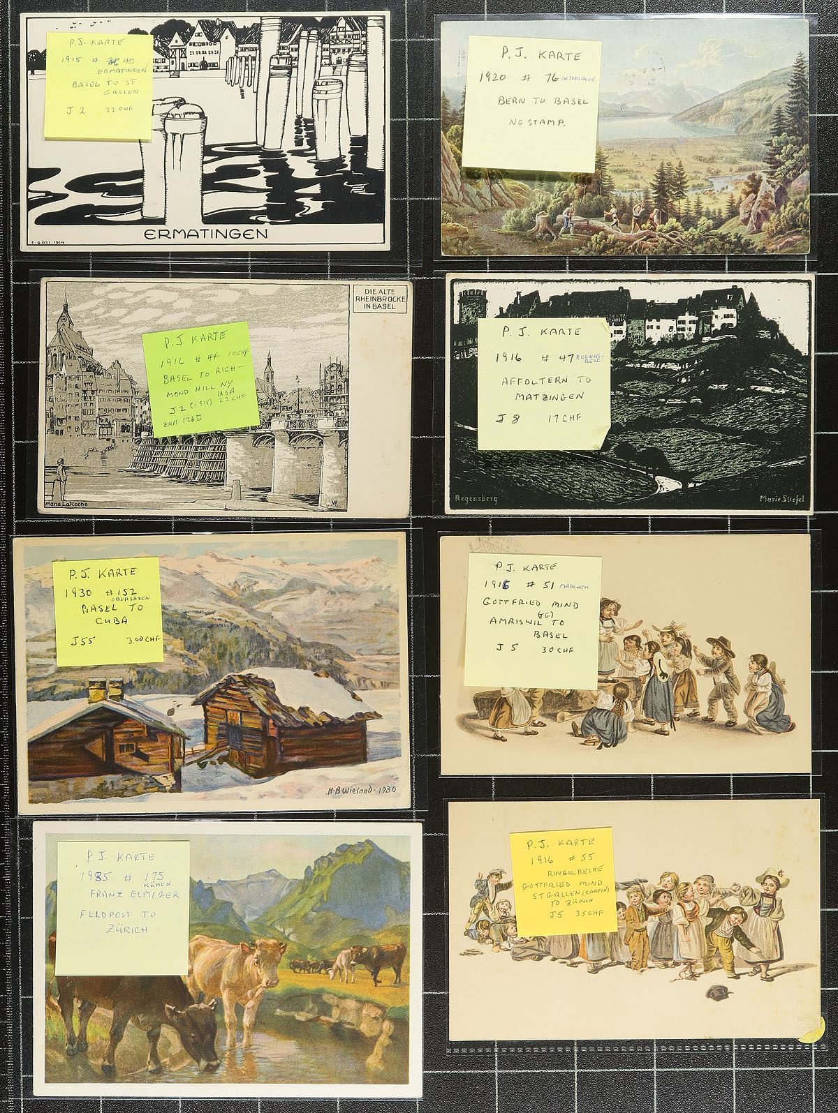 Interesting collection of Switzerland postal stationery and Pro-Juventute cards, 1912-1949, with roughly 160 items in total. We note almost all the items are used, mostly for domestic purposes, but did spot foreign destinations including Cuba, France, United States, Germany, and perhaps more, along with a wide variety of frankings including several semi-postals. Postmark interest includes bridge types, railways, feldpost, slogan, and more. Almost all the cards are sleeved and identified by the owner, with retail prices ranging from $2 to $8 each. A very collectible lot for the picture side, or for the postal history. Estimate =