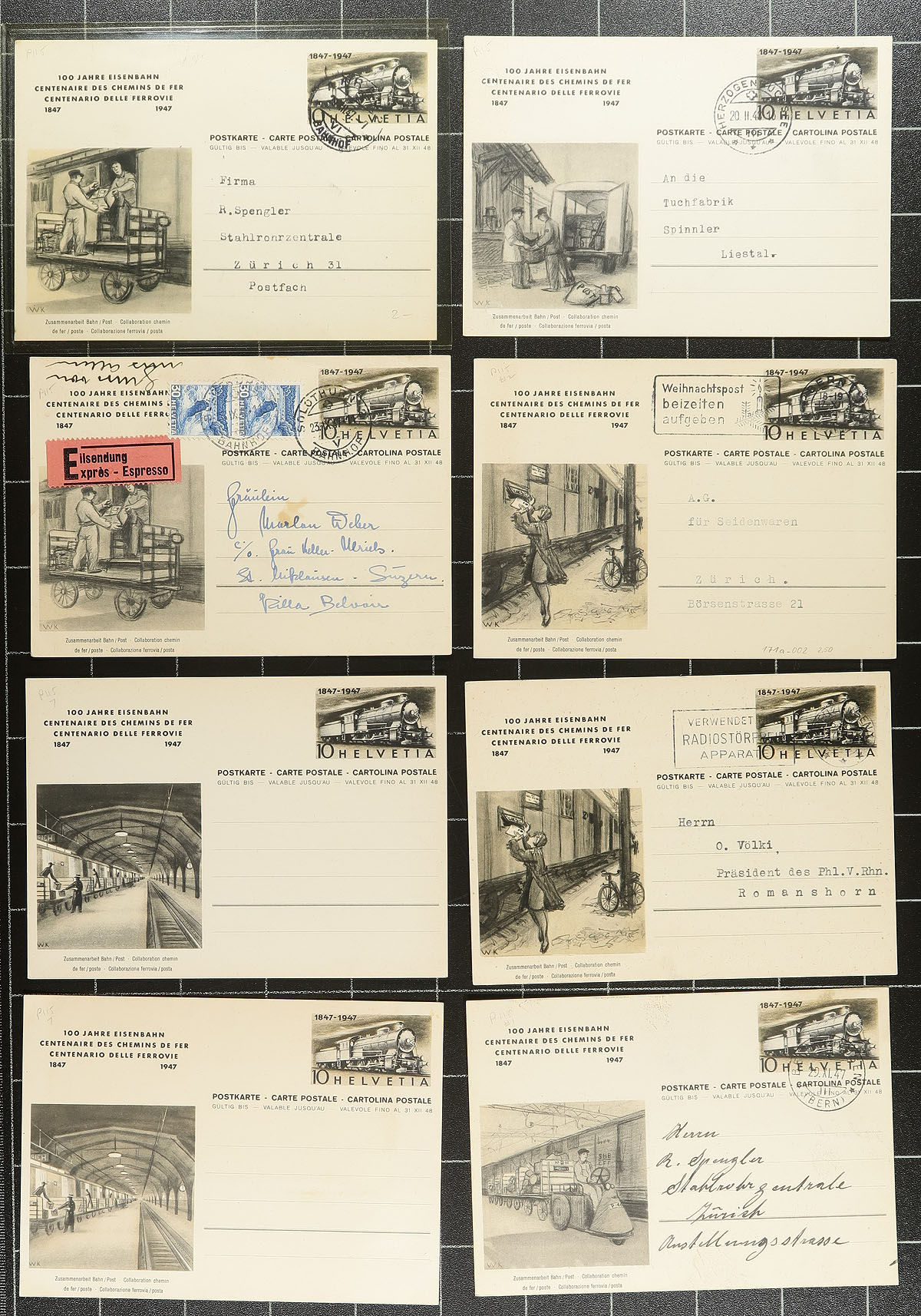 Interesting collection of Switzerland postal stationery and Pro-Juventute cards, 1912-1949, with roughly 160 items in total. We note almost all the items are used, mostly for domestic purposes, but did spot foreign destinations including Cuba, France, United States, Germany, and perhaps more, along with a wide variety of frankings including several semi-postals. Postmark interest includes bridge types, railways, feldpost, slogan, and more. Almost all the cards are sleeved and identified by the owner, with retail prices ranging from $2 to $8 each. A very collectible lot for the picture side, or for the postal history. Estimate =