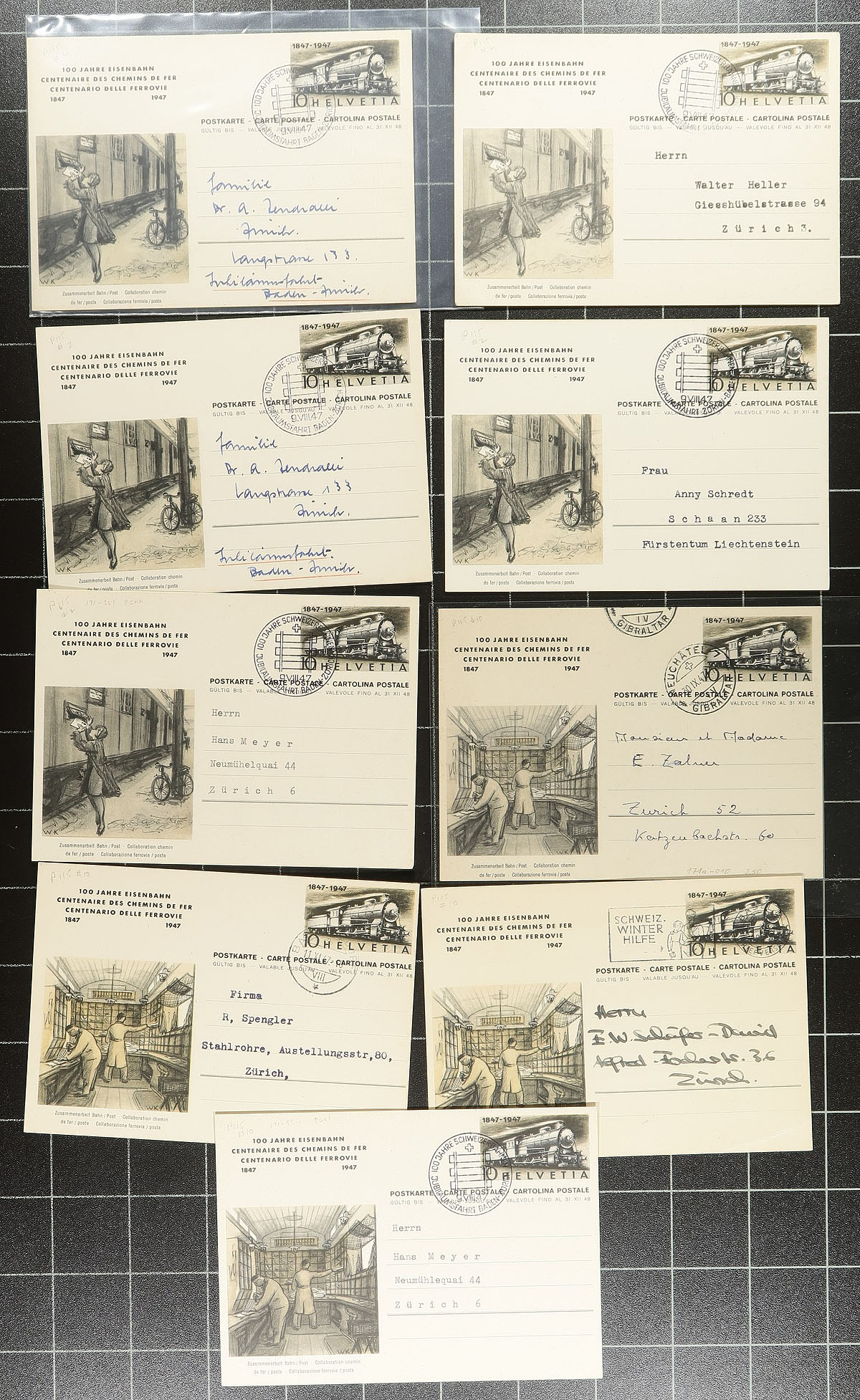 Interesting collection of Switzerland postal stationery and Pro-Juventute cards, 1912-1949, with roughly 160 items in total. We note almost all the items are used, mostly for domestic purposes, but did spot foreign destinations including Cuba, France, United States, Germany, and perhaps more, along with a wide variety of frankings including several semi-postals. Postmark interest includes bridge types, railways, feldpost, slogan, and more. Almost all the cards are sleeved and identified by the owner, with retail prices ranging from $2 to $8 each. A very collectible lot for the picture side, or for the postal history. Estimate =