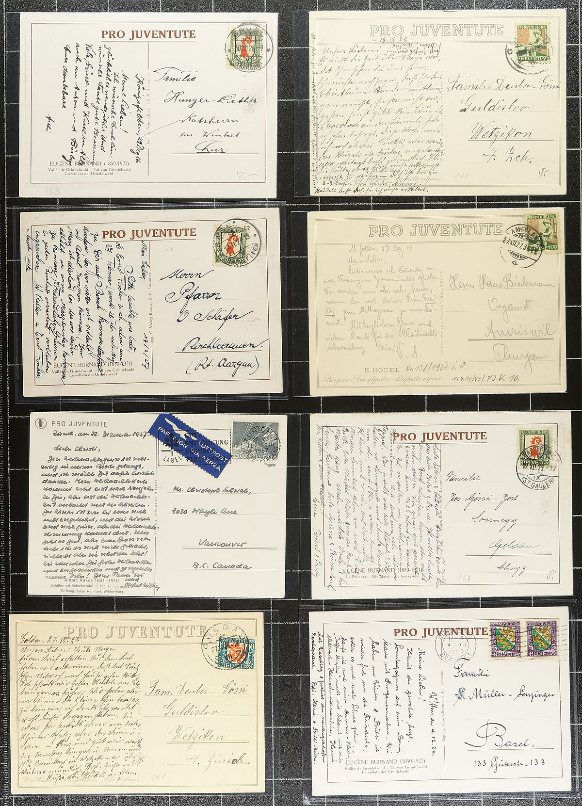 Interesting collection of Switzerland postal stationery and Pro-Juventute cards, 1912-1949, with roughly 160 items in total. We note almost all the items are used, mostly for domestic purposes, but did spot foreign destinations including Cuba, France, United States, Germany, and perhaps more, along with a wide variety of frankings including several semi-postals. Postmark interest includes bridge types, railways, feldpost, slogan, and more. Almost all the cards are sleeved and identified by the owner, with retail prices ranging from $2 to $8 each. A very collectible lot for the picture side, or for the postal history. Estimate =