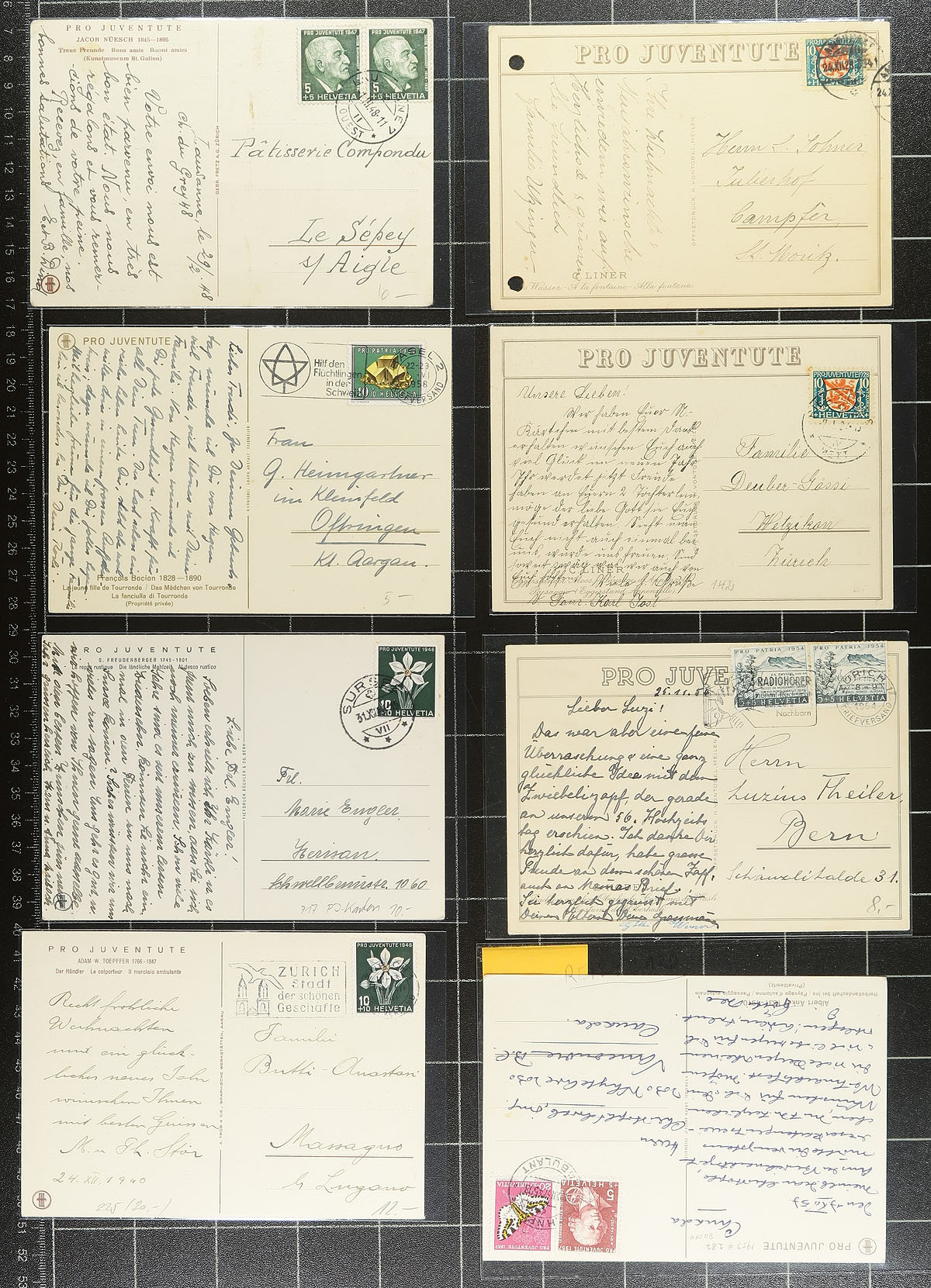 Interesting collection of Switzerland postal stationery and Pro-Juventute cards, 1912-1949, with roughly 160 items in total. We note almost all the items are used, mostly for domestic purposes, but did spot foreign destinations including Cuba, France, United States, Germany, and perhaps more, along with a wide variety of frankings including several semi-postals. Postmark interest includes bridge types, railways, feldpost, slogan, and more. Almost all the cards are sleeved and identified by the owner, with retail prices ranging from $2 to $8 each. A very collectible lot for the picture side, or for the postal history. Estimate =