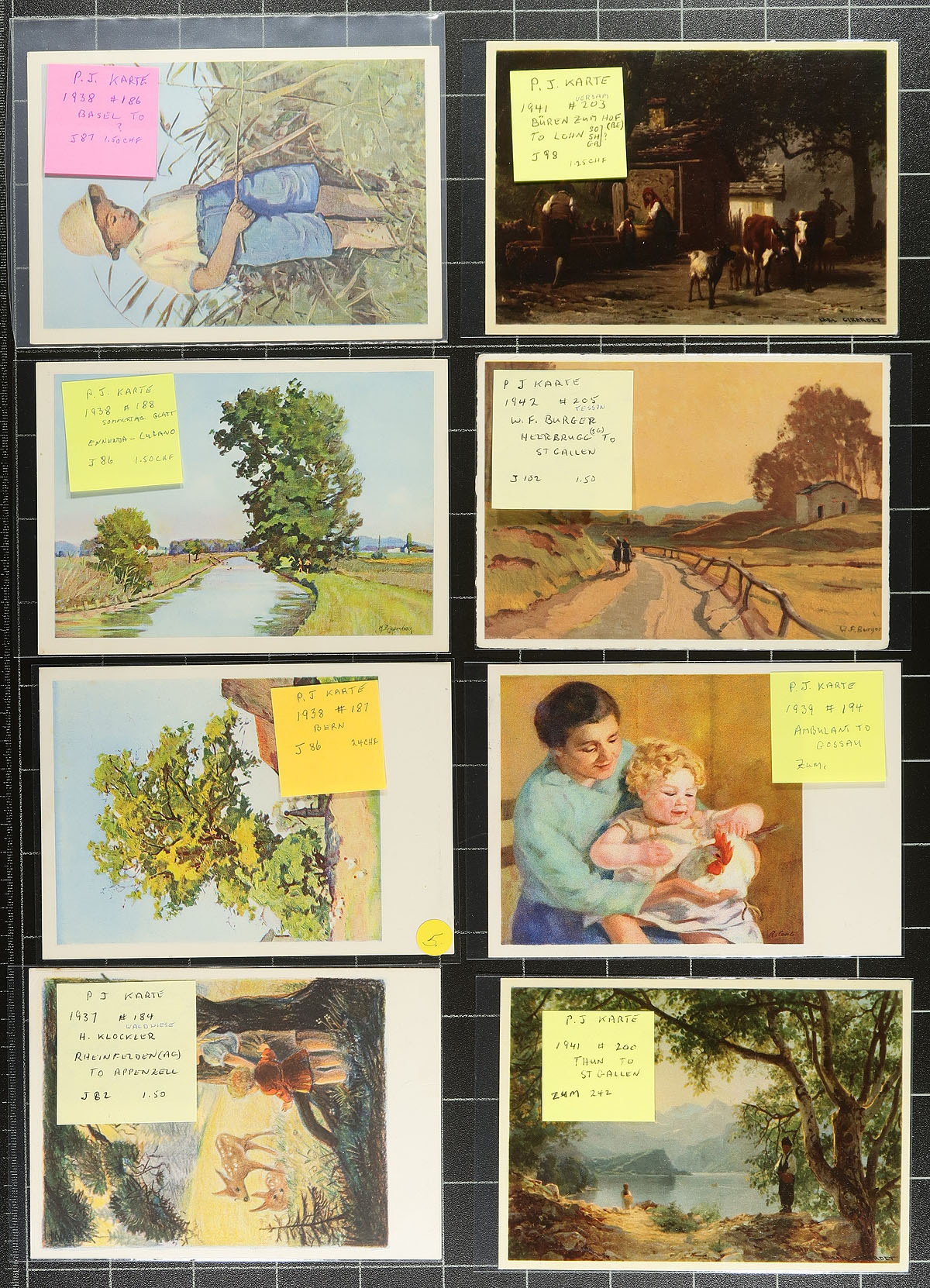 Interesting collection of Switzerland postal stationery and Pro-Juventute cards, 1912-1949, with roughly 160 items in total. We note almost all the items are used, mostly for domestic purposes, but did spot foreign destinations including Cuba, France, United States, Germany, and perhaps more, along with a wide variety of frankings including several semi-postals. Postmark interest includes bridge types, railways, feldpost, slogan, and more. Almost all the cards are sleeved and identified by the owner, with retail prices ranging from $2 to $8 each. A very collectible lot for the picture side, or for the postal history. Estimate =