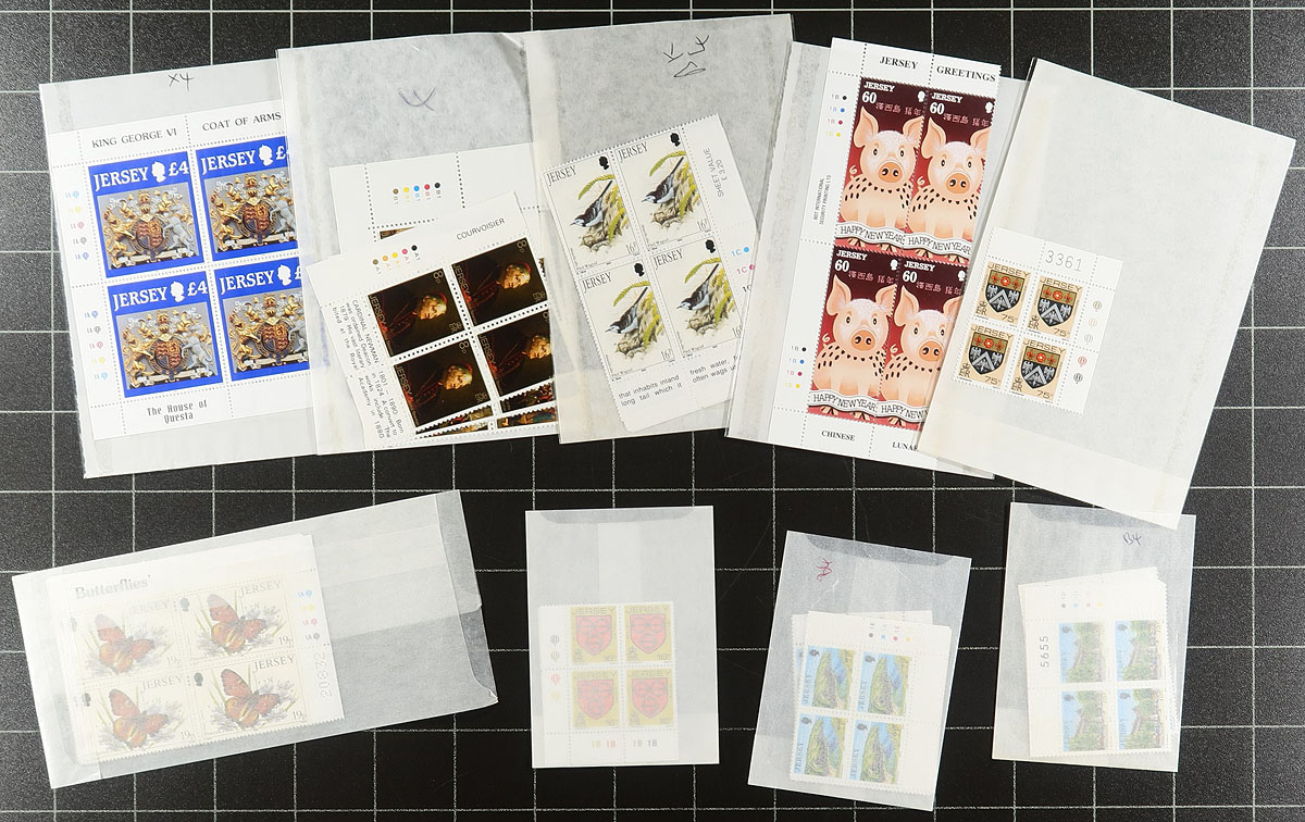 Collection of never hinged blocks in a cigar box, 1970's-1990's, all having "traffic light" inscriptions all still in original packaging from the postal services. We estimate many hundreds of blocks, noting sets, commemorative, definitives, and high denominations. A potentially high cataloguing lot, face value alone totals £477.00. A nice lot for the Commonwealth, topical, or thematic collector. Estimate =