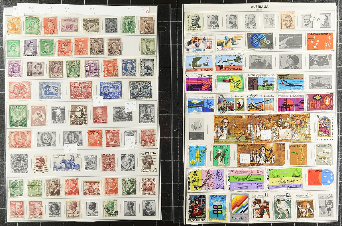 Nice accumulation of used Australia, 1913-2009, containing over 1,300 stamps in roughly 25 stock or album pages. The lot generally ranges from Scott #1/3189, including a selection of Kangaroos, KGV Heads, and back of the book material. A spot check indicated a few stamps and partial sets cataloguing $10 and up, with owner's 2018 Scott catalogue value for the collection totaling US$1,776.00. Duplication up to 3 to 5 for some issues. A good lot for the Australia or Commonwealth collector, a few faults expected, overall fine to very fine. Estimate =