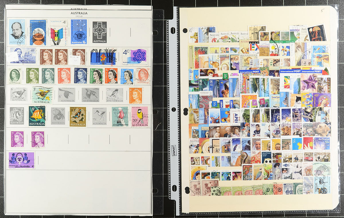 Nice accumulation of used Australia, 1913-2009, containing over 1,300 stamps in roughly 25 stock or album pages. The lot generally ranges from Scott #1/3189, including a selection of Kangaroos, KGV Heads, and back of the book material. A spot check indicated a few stamps and partial sets cataloguing $10 and up, with owner's 2018 Scott catalogue value for the collection totaling US$1,776.00. Duplication up to 3 to 5 for some issues. A good lot for the Australia or Commonwealth collector, a few faults expected, overall fine to very fine. Estimate =