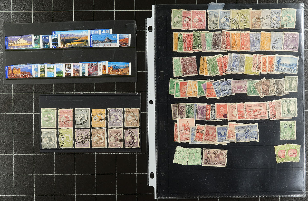 Nice accumulation of used Australia, 1913-2009, containing over 1,300 stamps in roughly 25 stock or album pages. The lot generally ranges from Scott #1/3189, including a selection of Kangaroos, KGV Heads, and back of the book material. A spot check indicated a few stamps and partial sets cataloguing $10 and up, with owner's 2018 Scott catalogue value for the collection totaling US$1,776.00. Duplication up to 3 to 5 for some issues. A good lot for the Australia or Commonwealth collector, a few faults expected, overall fine to very fine. Estimate =