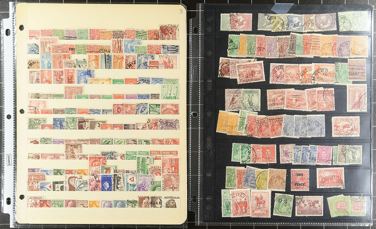 Nice accumulation of used Australia, 1913-2009, containing over 1,300 stamps in roughly 25 stock or album pages. The lot generally ranges from Scott #1/3189, including a selection of Kangaroos, KGV Heads, and back of the book material. A spot check indicated a few stamps and partial sets cataloguing $10 and up, with owner's 2018 Scott catalogue value for the collection totaling US$1,776.00. Duplication up to 3 to 5 for some issues. A good lot for the Australia or Commonwealth collector, a few faults expected, overall fine to very fine. Estimate =
