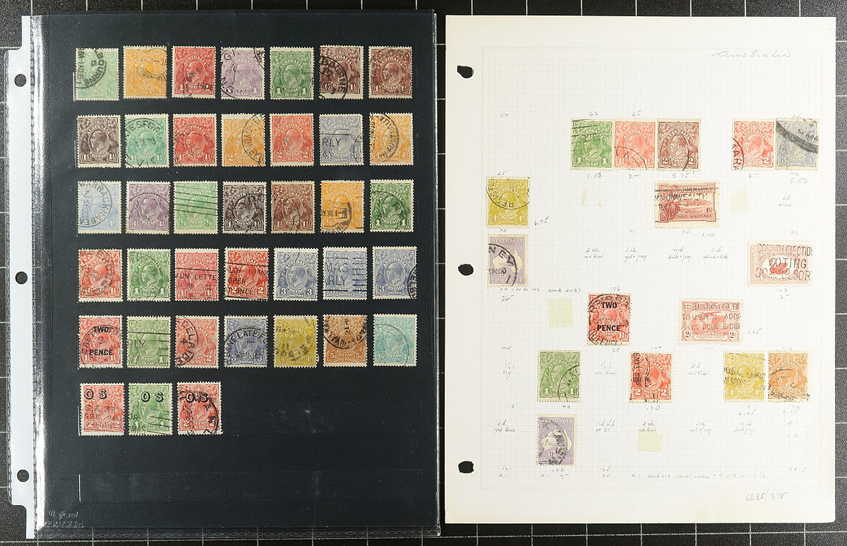 Nice accumulation of used Australia, 1913-2009, containing over 1,300 stamps in roughly 25 stock or album pages. The lot generally ranges from Scott #1/3189, including a selection of Kangaroos, KGV Heads, and back of the book material. A spot check indicated a few stamps and partial sets cataloguing $10 and up, with owner's 2018 Scott catalogue value for the collection totaling US$1,776.00. Duplication up to 3 to 5 for some issues. A good lot for the Australia or Commonwealth collector, a few faults expected, overall fine to very fine. Estimate =