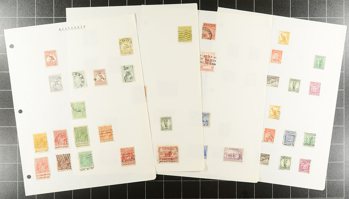 Nice accumulation of used Australia, 1913-2009, containing over 1,300 stamps in roughly 25 stock or album pages. The lot generally ranges from Scott #1/3189, including a selection of Kangaroos, KGV Heads, and back of the book material. A spot check indicated a few stamps and partial sets cataloguing $10 and up, with owner's 2018 Scott catalogue value for the collection totaling US$1,776.00. Duplication up to 3 to 5 for some issues. A good lot for the Australia or Commonwealth collector, a few faults expected, overall fine to very fine. Estimate =