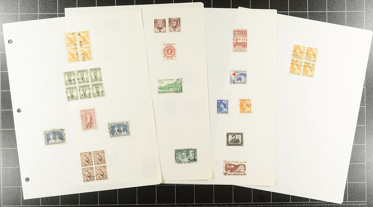 Nice accumulation of used Australia, 1913-2009, containing over 1,300 stamps in roughly 25 stock or album pages. The lot generally ranges from Scott #1/3189, including a selection of Kangaroos, KGV Heads, and back of the book material. A spot check indicated a few stamps and partial sets cataloguing $10 and up, with owner's 2018 Scott catalogue value for the collection totaling US$1,776.00. Duplication up to 3 to 5 for some issues. A good lot for the Australia or Commonwealth collector, a few faults expected, overall fine to very fine. Estimate =