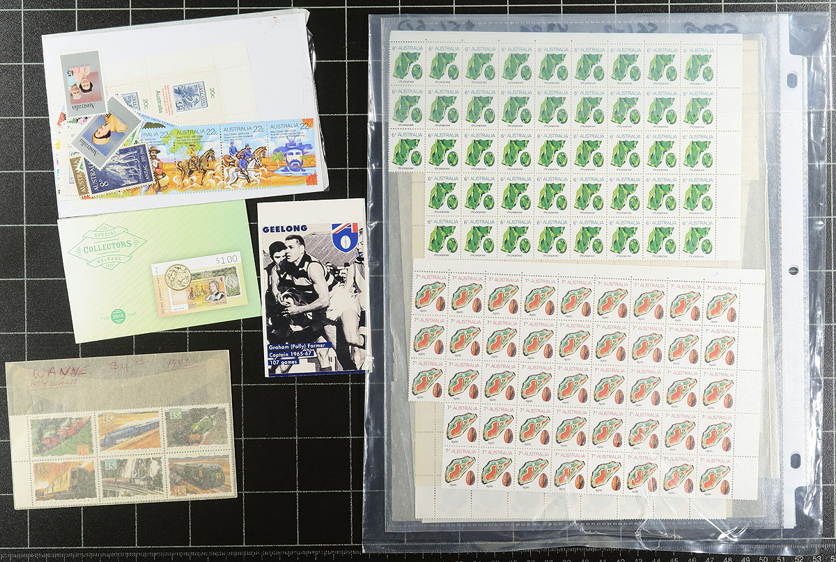 Lovely grouping of never hinged Australia, 1920's-2007, containing many hundreds of stamps in a variety of formats. The lot begins with "The Australian Territories Collection", from Australian Post which includes many sets, souvenir sheets, and sheetlets, from 1995 to 2007, noting representation from Australia, Cocos (Keeling) Islands, Christmas Island, and Australian Antarctic Territory. The lot continues with a stockbook containing mostly gutter blocks, strips, mini panes etc from the 1970's to 2003, along with singles, sets, blocks, and more from the 1920s onwards. A lovely lot for all collectors with good catalogue values and face value potential. Estimate =