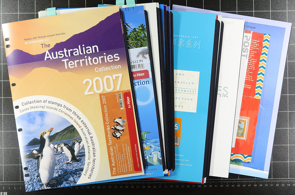 Lovely grouping of never hinged Australia, 1920's-2007, containing many hundreds of stamps in a variety of formats. The lot begins with "The Australian Territories Collection", from Australian Post which includes many sets, souvenir sheets, and sheetlets, from 1995 to 2007, noting representation from Australia, Cocos (Keeling) Islands, Christmas Island, and Australian Antarctic Territory. The lot continues with a stockbook containing mostly gutter blocks, strips, mini panes etc from the 1970's to 2003, along with singles, sets, blocks, and more from the 1920s onwards. A lovely lot for all collectors with good catalogue values and face value potential. Estimate =