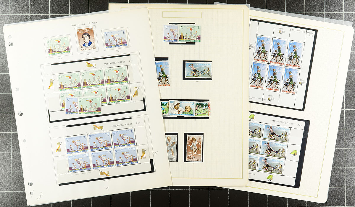 NZ Health Stamp Collection 1939-2000 including mint / used, miniature sheets etc. A well-organized run of material, all in mounts on album pages. While the earlier mint tends to be hinged (spot check showed Lightly Hinged), the stamps shift to mostly Never Hinged by the mid-1960's. A very clean offering. 2026 Scott US$617.30 =