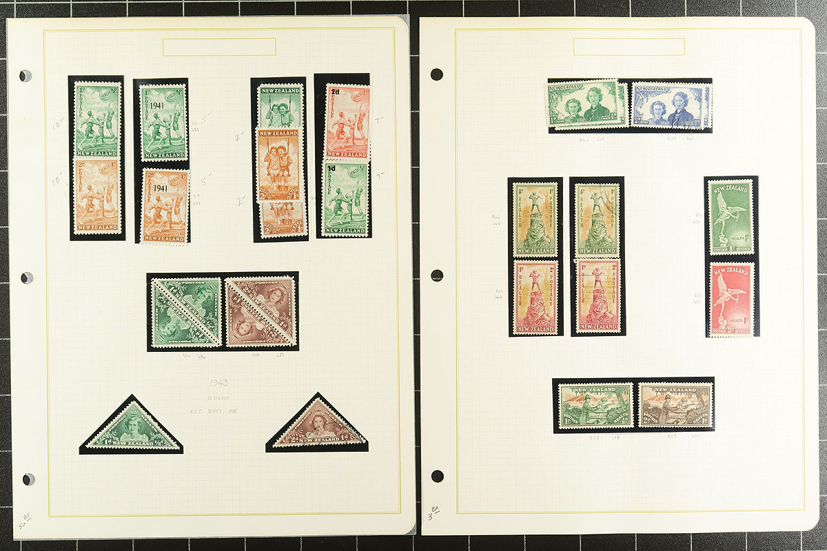 NZ Health Stamp Collection 1939-2000 including mint / used, miniature sheets etc. A well-organized run of material, all in mounts on album pages. While the earlier mint tends to be hinged (spot check showed Lightly Hinged), the stamps shift to mostly Never Hinged by the mid-1960's. A very clean offering. 2026 Scott US$617.30 =