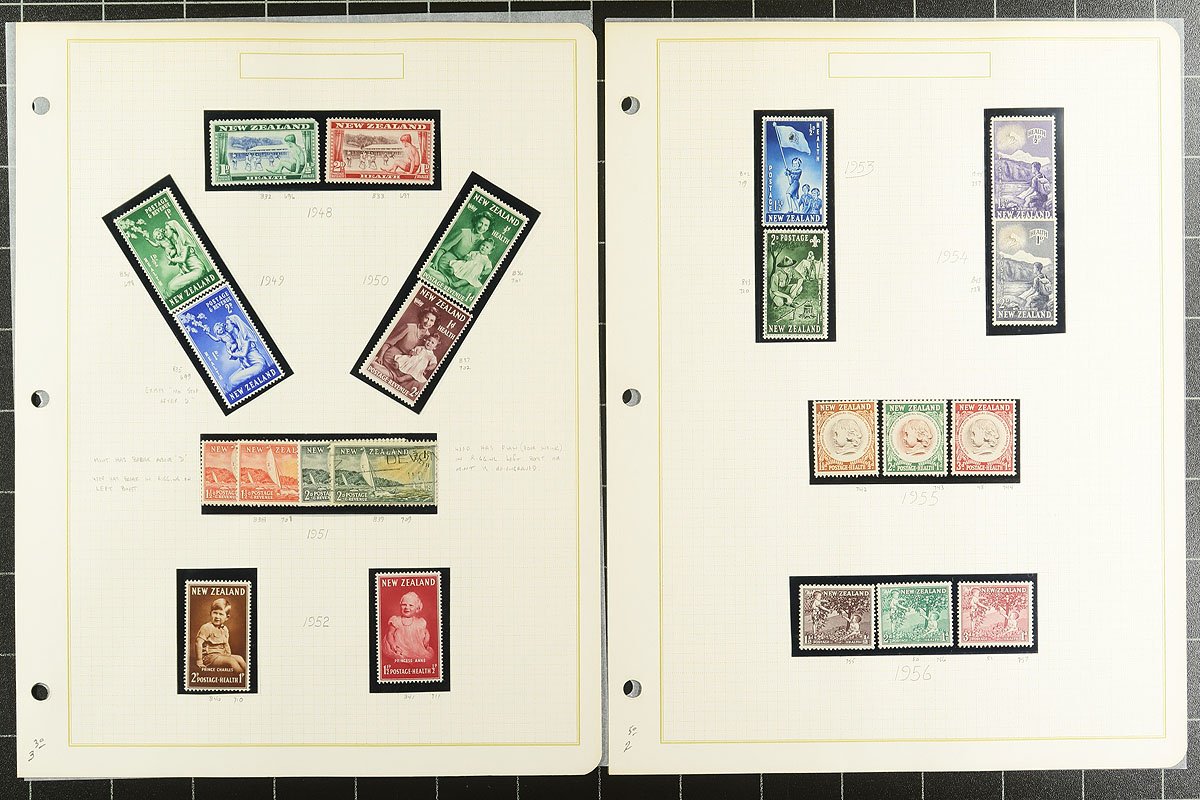 NZ Health Stamp Collection 1939-2000 including mint / used, miniature sheets etc. A well-organized run of material, all in mounts on album pages. While the earlier mint tends to be hinged (spot check showed Lightly Hinged), the stamps shift to mostly Never Hinged by the mid-1960's. A very clean offering. 2026 Scott US$617.30 =