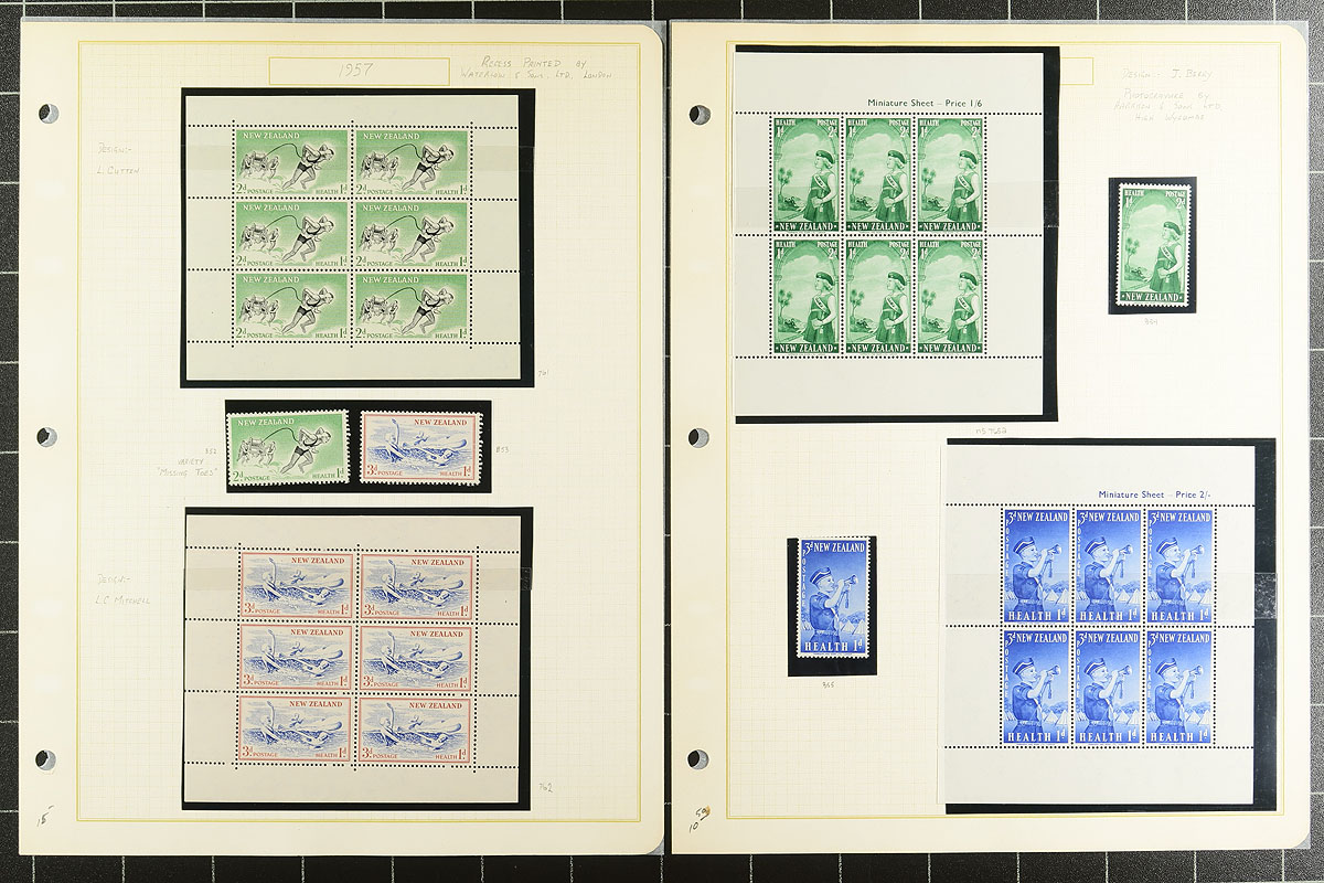 NZ Health Stamp Collection 1939-2000 including mint / used, miniature sheets etc. A well-organized run of material, all in mounts on album pages. While the earlier mint tends to be hinged (spot check showed Lightly Hinged), the stamps shift to mostly Never Hinged by the mid-1960's. A very clean offering. 2026 Scott US$617.30 =