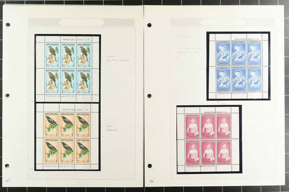 NZ Health Stamp Collection 1939-2000 including mint / used, miniature sheets etc. A well-organized run of material, all in mounts on album pages. While the earlier mint tends to be hinged (spot check showed Lightly Hinged), the stamps shift to mostly Never Hinged by the mid-1960's. A very clean offering. 2026 Scott US$617.30 =