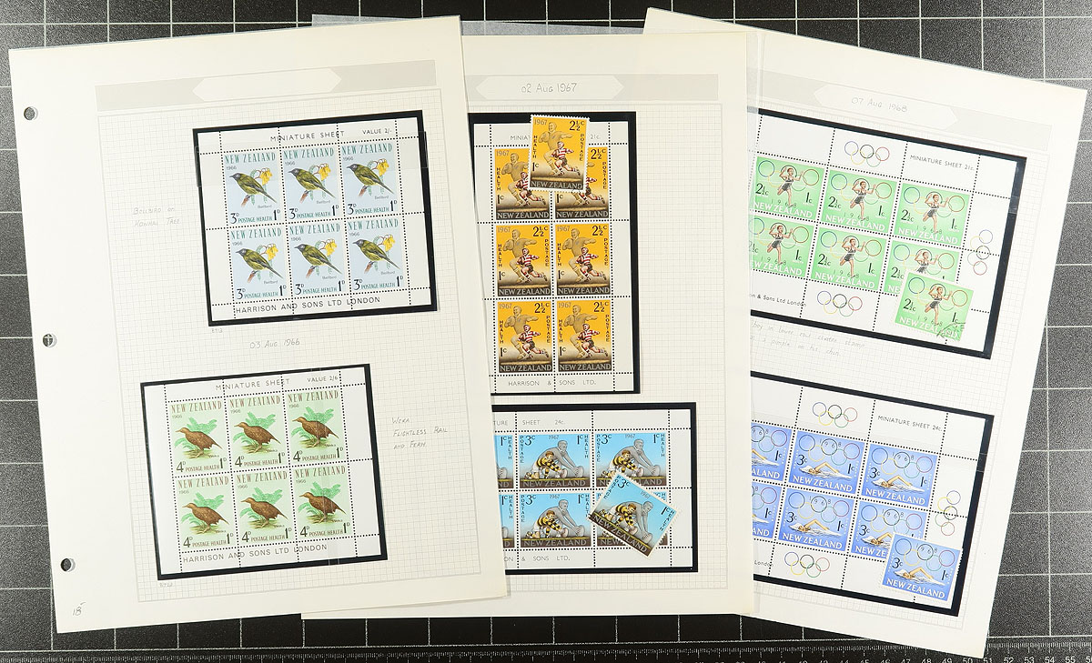 NZ Health Stamp Collection 1939-2000 including mint / used, miniature sheets etc. A well-organized run of material, all in mounts on album pages. While the earlier mint tends to be hinged (spot check showed Lightly Hinged), the stamps shift to mostly Never Hinged by the mid-1960's. A very clean offering. 2026 Scott US$617.30 =