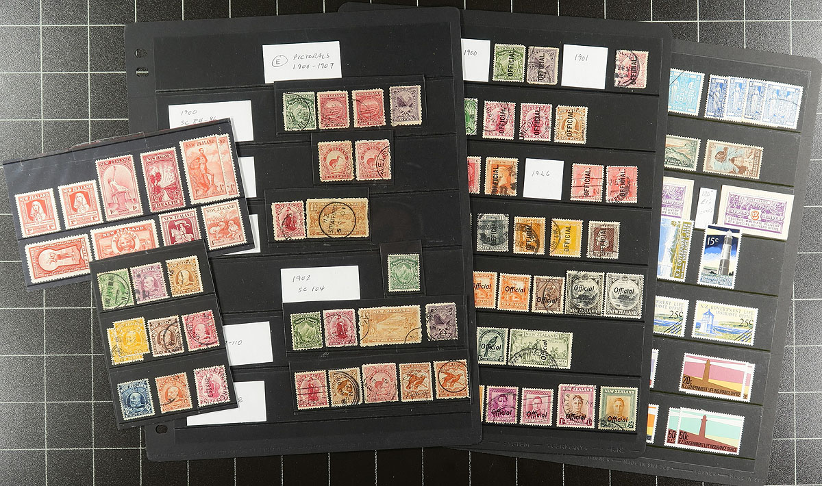 A lovely offering of mint and used better NZ in five distinct sections. In no particular order, included is 1) Edward VII used #130/139 on small card (catalogue value US$56.80). 2) Mint Hinged Health Stamps 1929-1938 on stockcard (catalogue value US$109.75). 3) NZ "Pictorials" 1900-1907, #84/128 selection of 18 used on stockpage (catalogue value US$196.90). 4) "Back of the Book" various issues, mint and used including Express Delivery, Fiscals and Life Insurance issues (catalogue US$182.20). 5) "Officials" selection of 1900-1954 QV to QEII overprint issues, mint and used on a double sided stockpage (catalogue US$157.40). A wonderful array of material, sure to please any NZ collector. Total 2026 Scott US$703.05 =