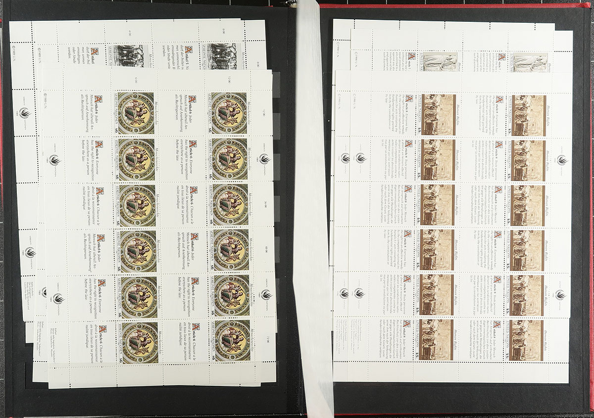 Stockbook with 1976-1992 complete sets in full sheets and mini-panes. Includes Human Rights and Flag sheets, etc. (most sheets duplicated). Consists of NY#278-279, 310-311, 325-340, 350-365, 374-389, 399-414, 425-440, 450-465, 477-492, 499-514, 515-516, 528-543, 554-569, 570-571, 582-583, 599-600, 616-617, 719-726. Geneva #61-62, 84-85, 119-120, 158-159, 180-181, 193-194, 209-210, 224-225. Vienna #37-38, 74-75, 95-96, 108-109, 123-124, 139-140. All VF MNH. The original face value in US Dollars / Swiss Francs and Austrian Schilling is well over $1000.00 CDN (converted). 2026 Scott US$1167.60 =