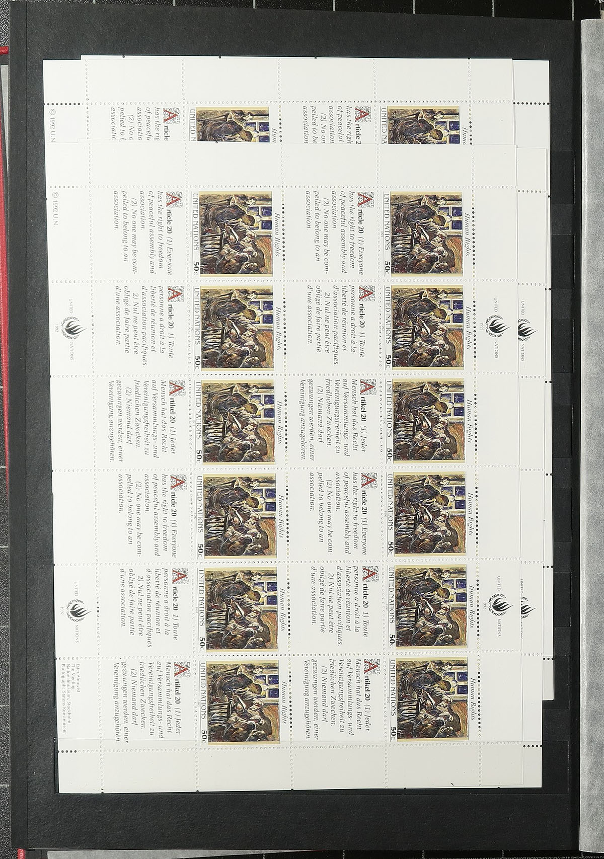 Stockbook with 1976-1992 complete sets in full sheets and mini-panes. Includes Human Rights and Flag sheets, etc. (most sheets duplicated). Consists of NY#278-279, 310-311, 325-340, 350-365, 374-389, 399-414, 425-440, 450-465, 477-492, 499-514, 515-516, 528-543, 554-569, 570-571, 582-583, 599-600, 616-617, 719-726. Geneva #61-62, 84-85, 119-120, 158-159, 180-181, 193-194, 209-210, 224-225. Vienna #37-38, 74-75, 95-96, 108-109, 123-124, 139-140. All VF MNH. The original face value in US Dollars / Swiss Francs and Austrian Schilling is well over $1000.00 CDN (converted). 2026 Scott US$1167.60 =