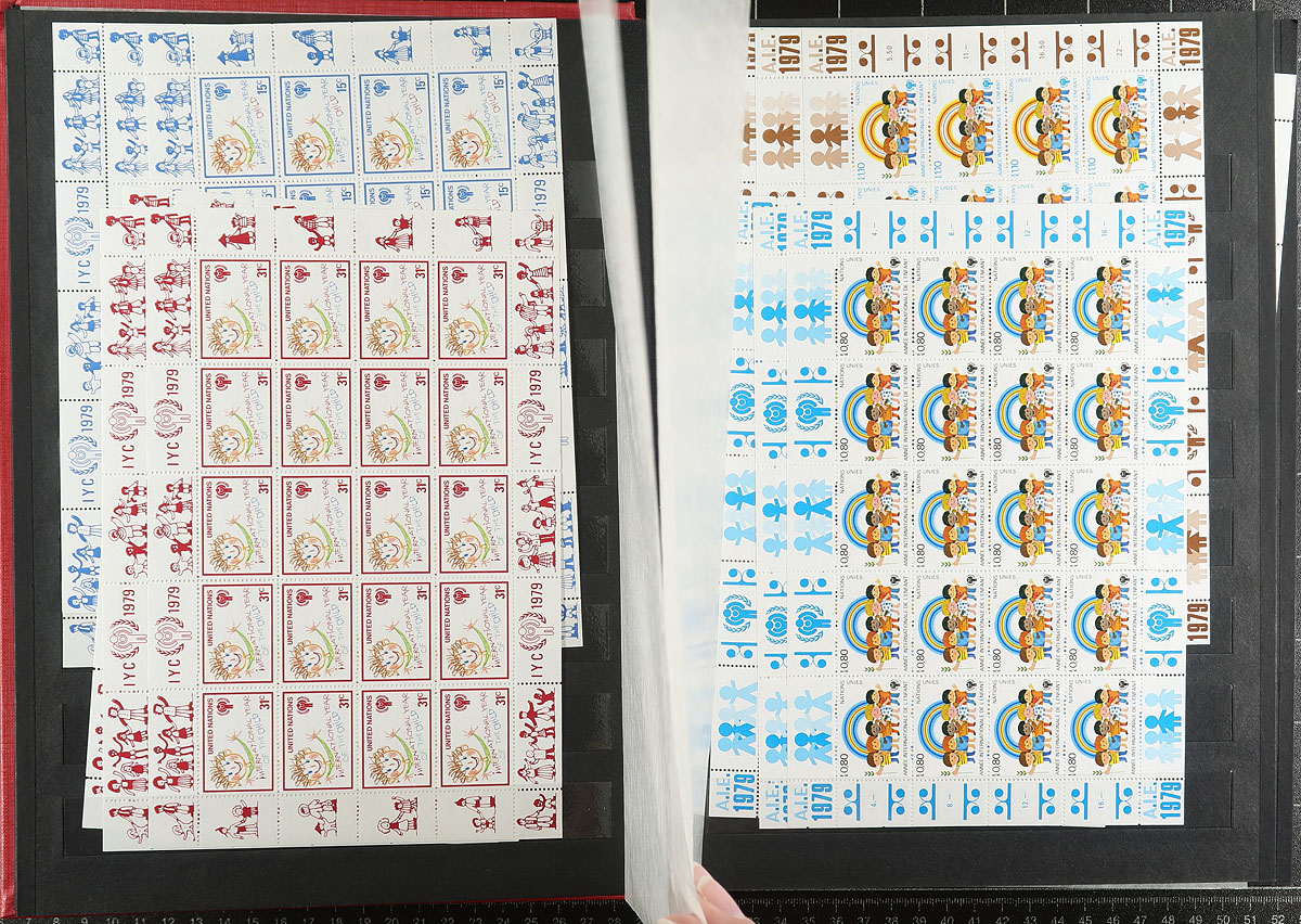 Stockbook with 1976-1992 complete sets in full sheets and mini-panes. Includes Human Rights and Flag sheets, etc. (most sheets duplicated). Consists of NY#278-279, 310-311, 325-340, 350-365, 374-389, 399-414, 425-440, 450-465, 477-492, 499-514, 515-516, 528-543, 554-569, 570-571, 582-583, 599-600, 616-617, 719-726. Geneva #61-62, 84-85, 119-120, 158-159, 180-181, 193-194, 209-210, 224-225. Vienna #37-38, 74-75, 95-96, 108-109, 123-124, 139-140. All VF MNH. The original face value in US Dollars / Swiss Francs and Austrian Schilling is well over $1000.00 CDN (converted). 2026 Scott US$1167.60 =