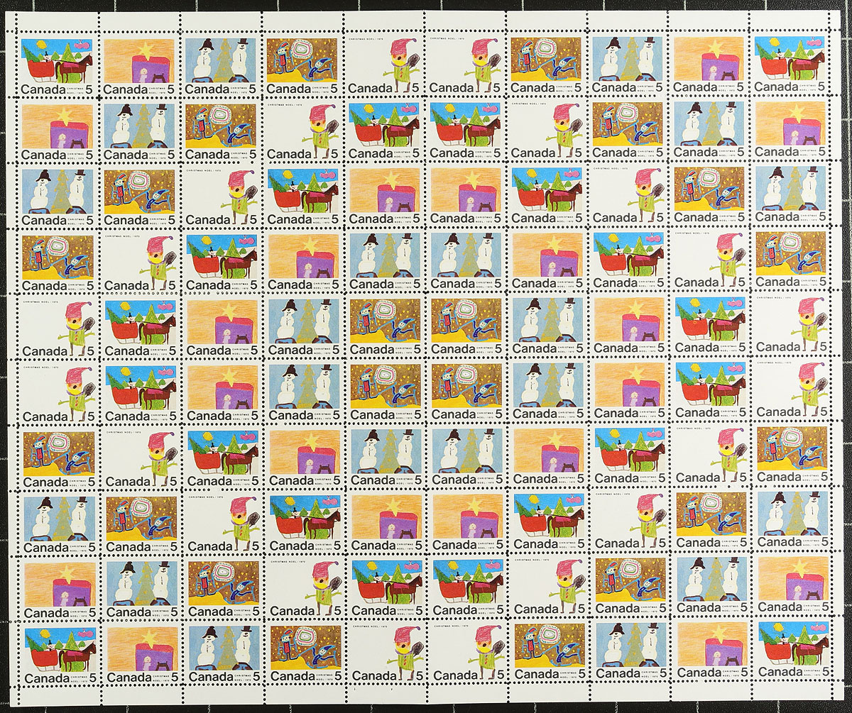 Complete Mint Never Hinged field stock (no inscription) sheets of 100 of the 5c and 6c stamps, plus complete sheets of 50 of each the 10c and 15c values of the 1970 issue Xmas issue. The 5c / 6c sheets include the famous identical centre blocks of four (lightly folded vertically once, affecting the blocks) while the 10c and 15c value sheets have not been folded. The 5c value has "no scratch through window", while the 6c value has the "dot between M and A". Catalogued as two centre blocks, then a singles, but certainly worth more as sheets. 2024 Unitrade =