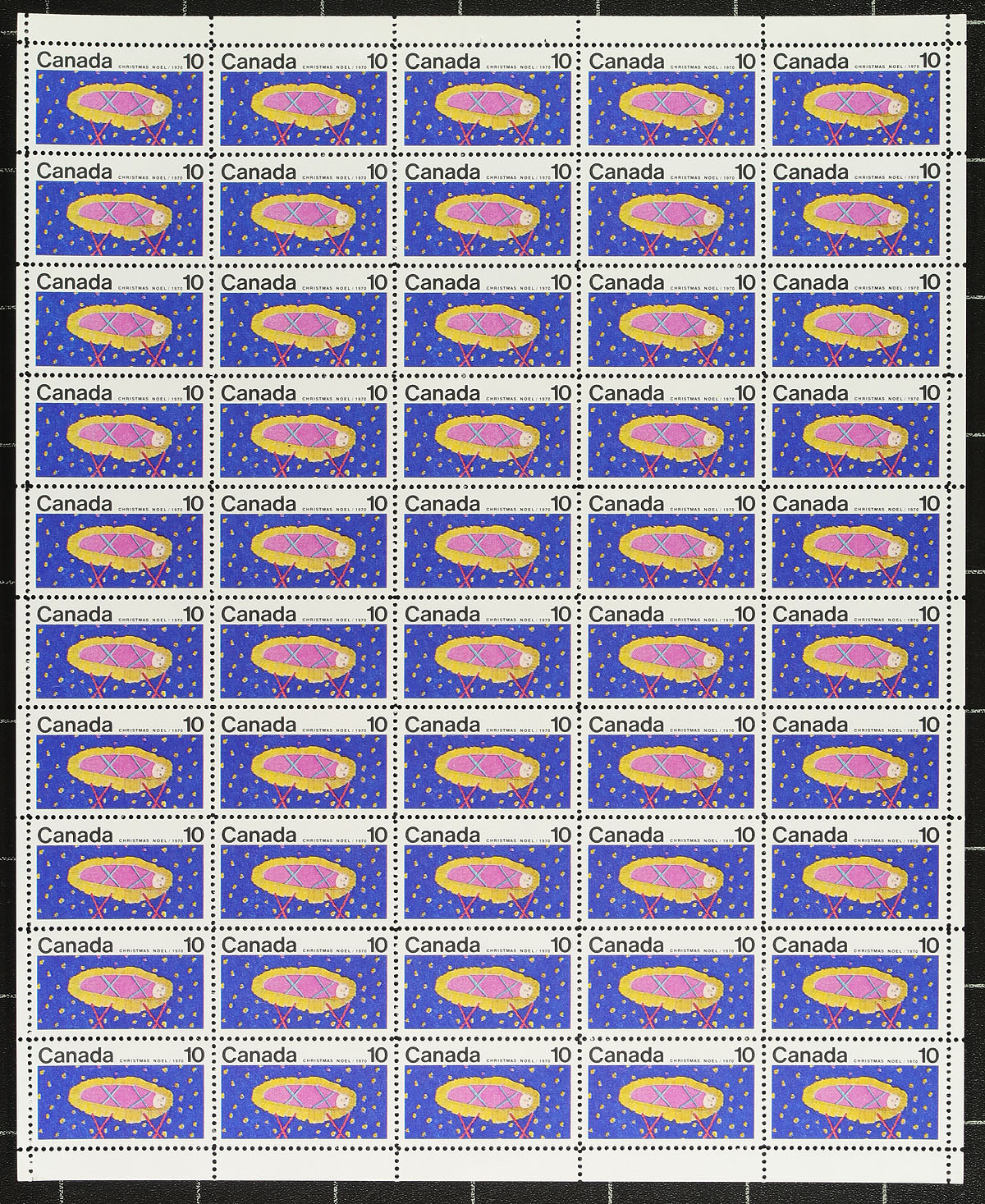 Complete Mint Never Hinged field stock (no inscription) sheets of 100 of the 5c and 6c stamps, plus complete sheets of 50 of each the 10c and 15c values of the 1970 issue Xmas issue. The 5c / 6c sheets include the famous identical centre blocks of four (lightly folded vertically once, affecting the blocks) while the 10c and 15c value sheets have not been folded. The 5c value has "no scratch through window", while the 6c value has the "dot between M and A". Catalogued as two centre blocks, then a singles, but certainly worth more as sheets. 2024 Unitrade =