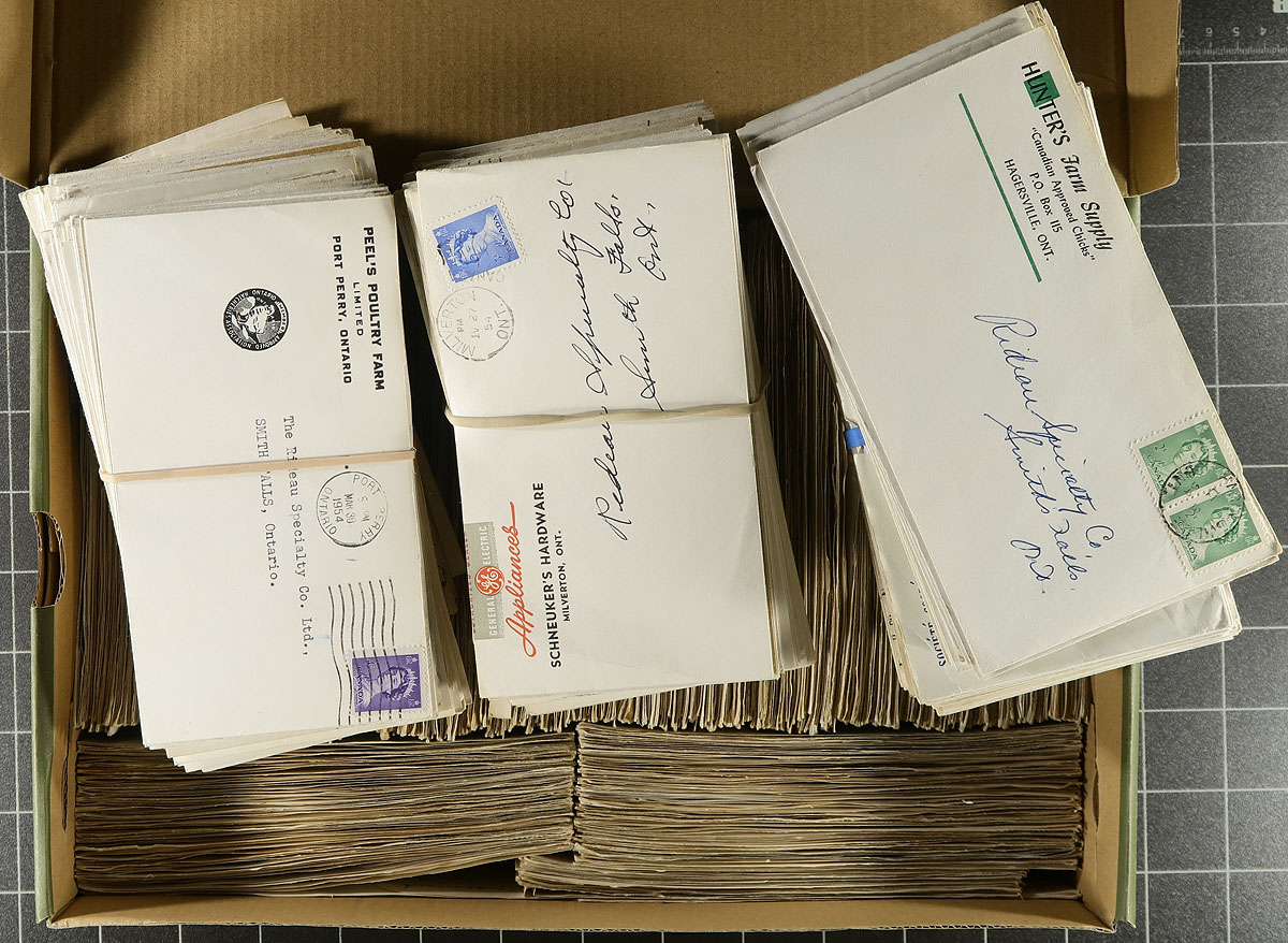 Poultry Farm Cover Hoard. A large shoebox, filled with easily 600-700 QEII era covers, all postmarked 1954 and posted to the "Rideau Specialty Co" in Smith Falls ONT. This company must have offered poultry supplies as all the covers have Corner Cards / Advertising from Poultry Farms / Hardware Stores and "chick" related business from primarily eastern Canada (Ontario, Quebec and Maritimes). All covers have the backflap removed, perhaps from when received at the addressee, but within this group is a wealth of interesting business covers and postmarks. Estimate =