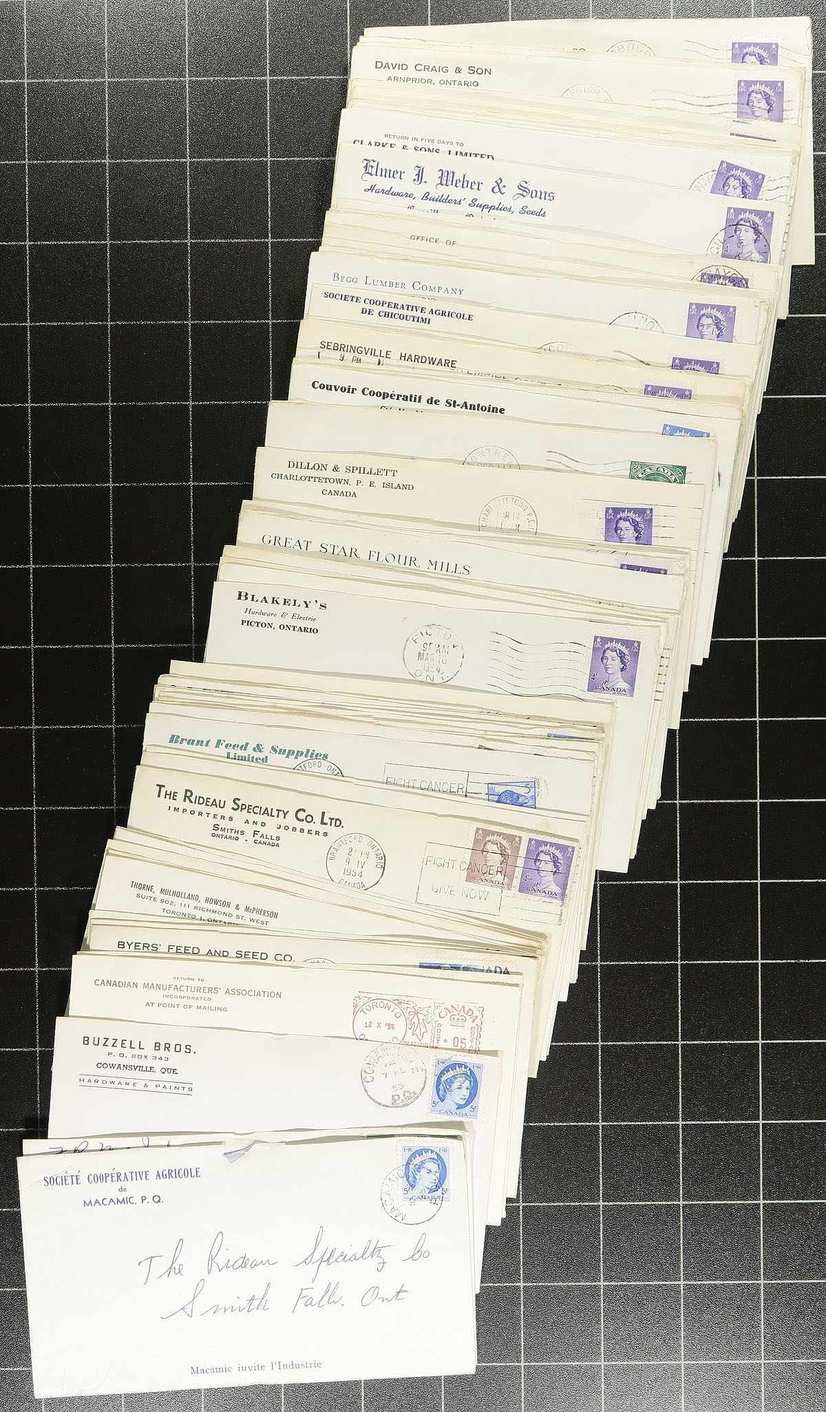 Poultry Farm Cover Hoard. A large shoebox, filled with easily 600-700 QEII era covers, all postmarked 1954 and posted to the "Rideau Specialty Co" in Smith Falls ONT. This company must have offered poultry supplies as all the covers have Corner Cards / Advertising from Poultry Farms / Hardware Stores and "chick" related business from primarily eastern Canada (Ontario, Quebec and Maritimes). All covers have the backflap removed, perhaps from when received at the addressee, but within this group is a wealth of interesting business covers and postmarks. Estimate =