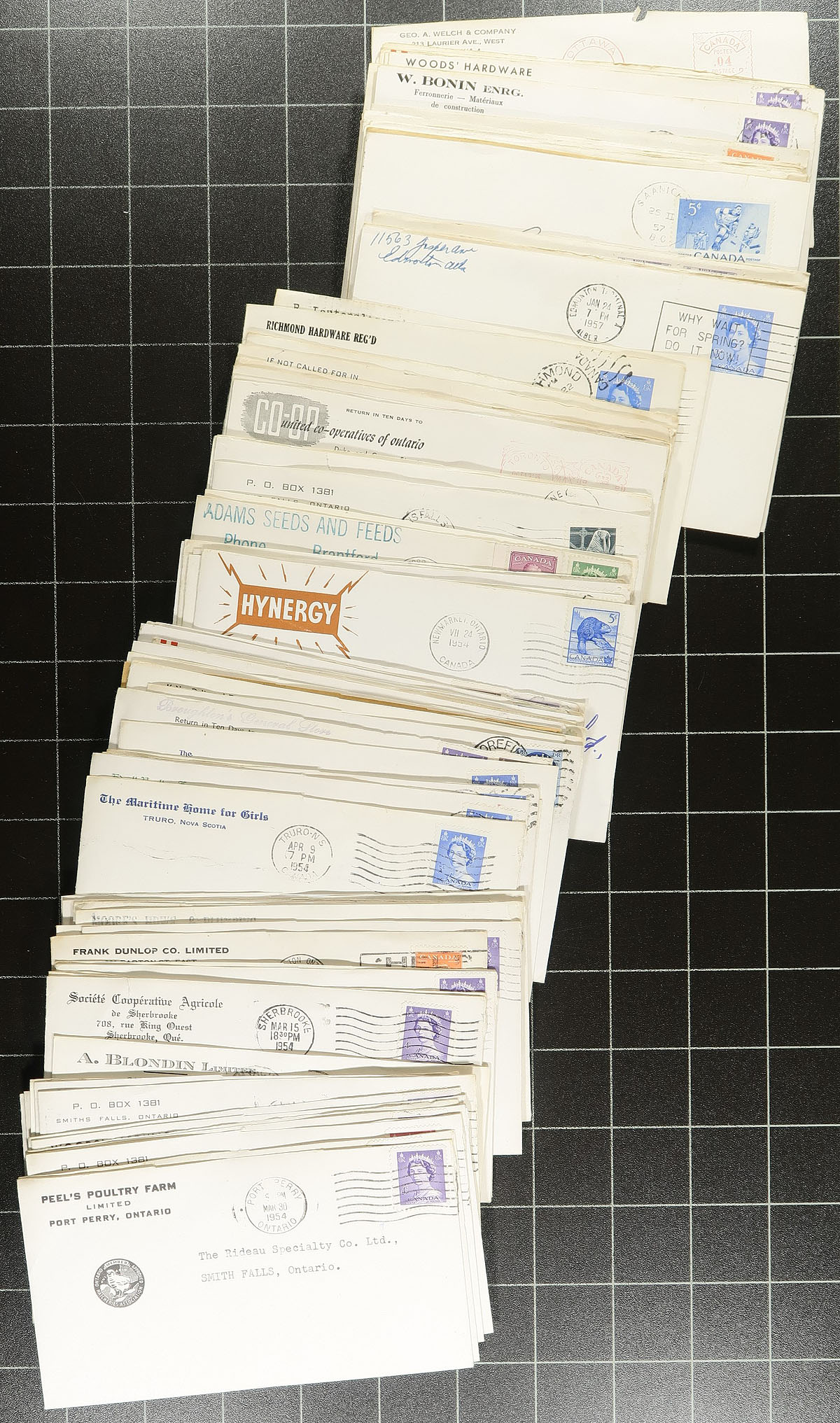 Poultry Farm Cover Hoard. A large shoebox, filled with easily 600-700 QEII era covers, all postmarked 1954 and posted to the "Rideau Specialty Co" in Smith Falls ONT. This company must have offered poultry supplies as all the covers have Corner Cards / Advertising from Poultry Farms / Hardware Stores and "chick" related business from primarily eastern Canada (Ontario, Quebec and Maritimes). All covers have the backflap removed, perhaps from when received at the addressee, but within this group is a wealth of interesting business covers and postmarks. Estimate =