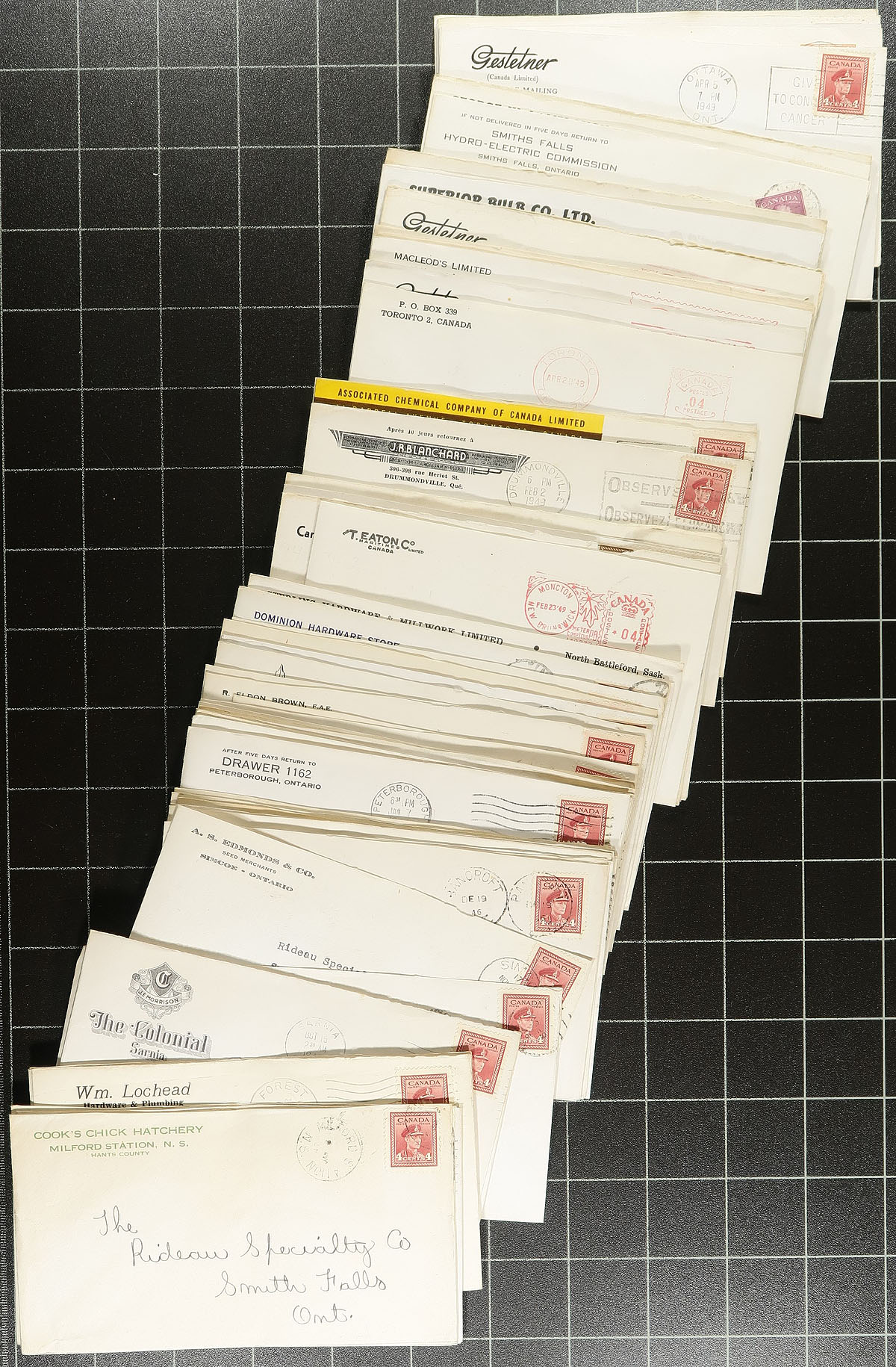 Poultry Farm Cover Hoard. A large shoebox, filled with easily 600-700 QEII era covers, all postmarked 1954 and posted to the "Rideau Specialty Co" in Smith Falls ONT. This company must have offered poultry supplies as all the covers have Corner Cards / Advertising from Poultry Farms / Hardware Stores and "chick" related business from primarily eastern Canada (Ontario, Quebec and Maritimes). All covers have the backflap removed, perhaps from when received at the addressee, but within this group is a wealth of interesting business covers and postmarks. Estimate =