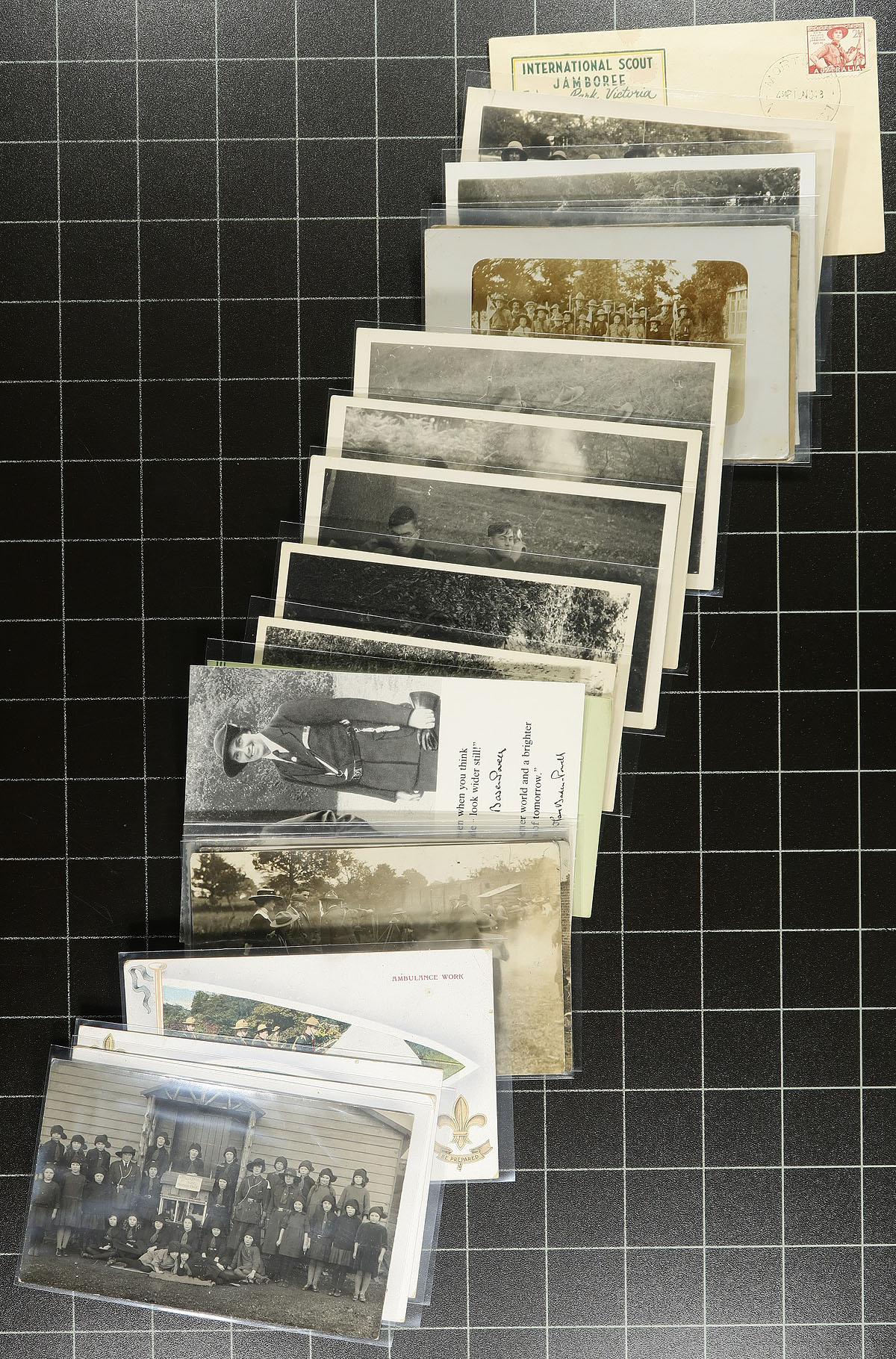 Scouts / Guides / Cadets Topical Collection. An interesting array of 21 postcards (plus one Australian First Day Cover and a Lord Baden Powell ink-blotter), all featuring scenes of Scouts, Guides or Cadets. Many better here, including several early RPPC (real photo postcards). A seldom offered selection. Estimate =